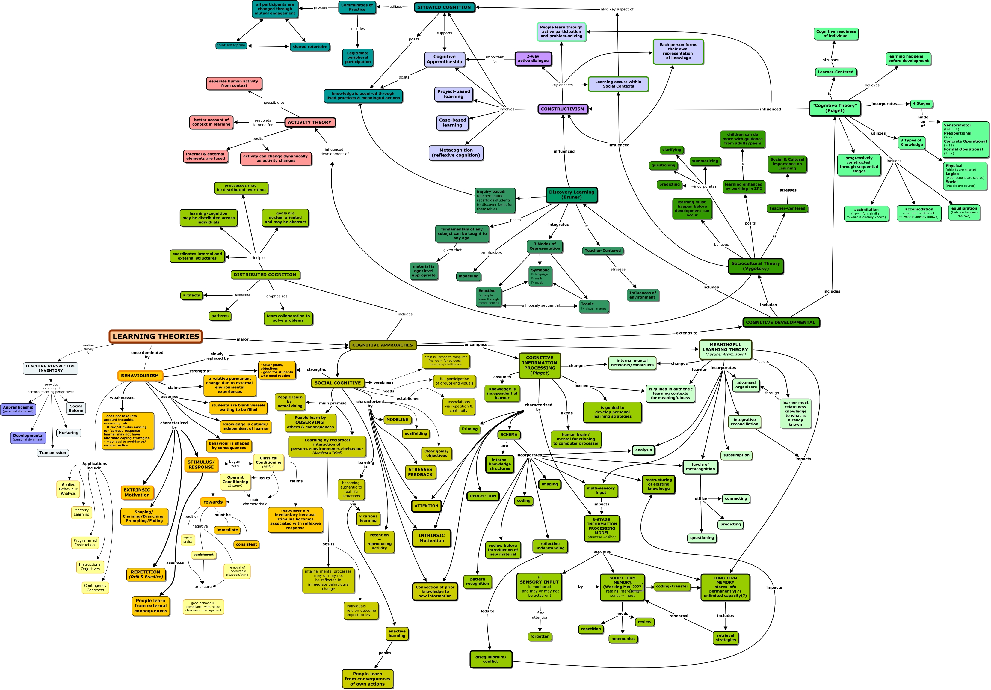 This Concept Map, created with IHMC CmapTools, has information related to: vicky earle map 1 update (Oct.08), BEHAVIOURISM assumes behaviour is shaped by consequences, becoming authentic to real life situations via vicarious learning, rewards must be immediate, CONSTRUCTIVISM key aspects Learning occurs within Social Contexts, rewards must be consistent, MEANINGFUL LEARNING THEORY (Ausubel Assimilation) incorporates analysis, TEACHING PERSPECTIVE INVENTORY provides summary of personal teaching perspectives: Nurturing, STIMULUS/ RESPONSE began with Classical Conditioning (Pavlov), becoming authentic to real life situations via enactive learning, SOCIAL COGNITIVE learning is becoming authentic to real life situations, reflective understanding leds to disequilibrium/ conflict, 2-way active dialogue important for Cognitive Apprenticeship, COGNITIVE INFORMATION PROCESSING (Piaget) learner is guided in authentic learning contexts for meaningfulness, SCHEMA incorporates coding, DISTRIBUTED COGNITION principle learning/cognition may be distributed across individuals, enactive learning posits People learn from consequences of own actions, CONSTRUCTIVISM involves SITUATED COGNITION, CONSTRUCTIVISM involves Case-based learning, TEACHING PERSPECTIVE INVENTORY provides summary of personal teaching perspectives: Apprenticeship (personal dominant), Discovery Learning (Bruner) ie Teacher-Centered