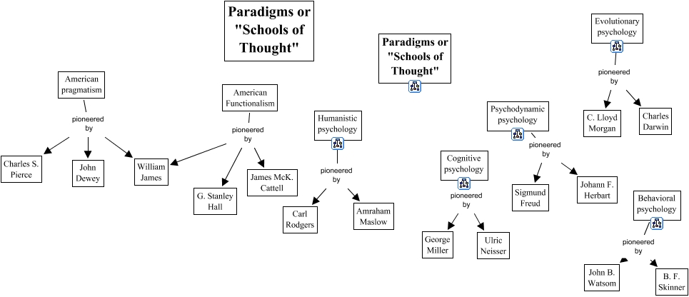 Deze Concept Map heeft informatie gerelateerd aan: Paradigms or _Schools of Thought_, American pragmatism pioneered by Charles S. Pierce, Behavioral psychology pioneered by John B. Watsom, American Functionalism pioneered by G. Stanley Hall, American Functionalism pioneered by William James, Evolutionary psychology pioneered by C. Lloyd Morgan, Cognitive psychology pioneered by Ulric Neisser, Humanistic psychology pioneered by Carl Rodgers, Humanistic psychology pioneered by Amraham Maslow, American Functionalism pioneered by James McK. Cattell, Psychodynamic psychology pioneered by Johann F. Herbart, American pragmatism pioneered by William James, Psychodynamic psychology pioneered by Sigmund Freud, Evolutionary psychology pioneered by Charles Darwin, Behavioral psychology pioneered by B. F. Skinner, American pragmatism pioneered by John Dewey, Cognitive psychology pioneered by George Miller