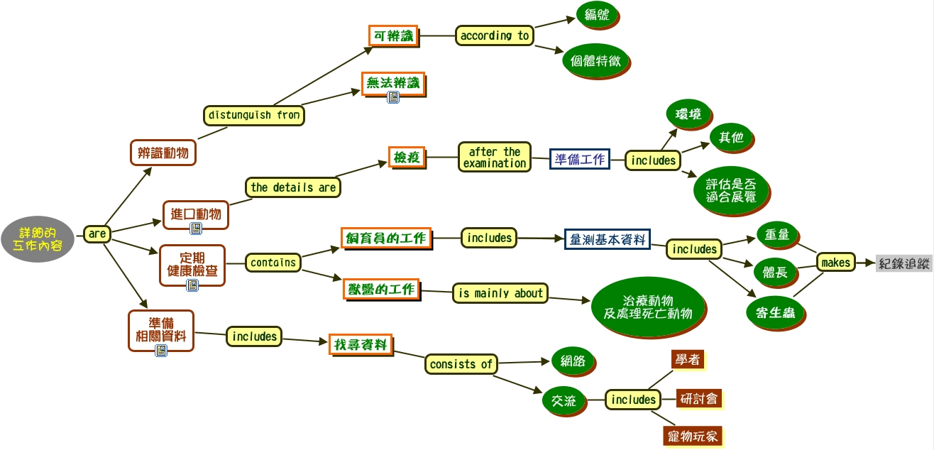 此概念图以 IHMC CmapTools 创建, 内含信息有关于: work content, 準備 相關資料 includes 找尋資料, 寄生蟲 makes 重量, 辨識動物 distunguish from 可辨識, 寄生蟲 makes 紀錄追蹤, 獸醫的工作 is mainly about 治療動物 及處理死亡動物, 詳細的 工作內容 are 定期 健康檢查, 交流 includes 研討會, 交流 includes 學者, 檢疫 after the examination 準備工作, 交流 includes 寵物玩家, 準備工作 includes 其他, 可辨識 according to 個體特徵, 找尋資料 consists of 網路, 飼育員的工作 includes 量測基本資料, 詳細的 工作內容 are 辨識動物, 紀錄追蹤 makes 重量, 量測基本資料 includes 重量, 詳細的 工作內容 are 準備 相關資料, 找尋資料 consists of 交流, 交流 includes 學者