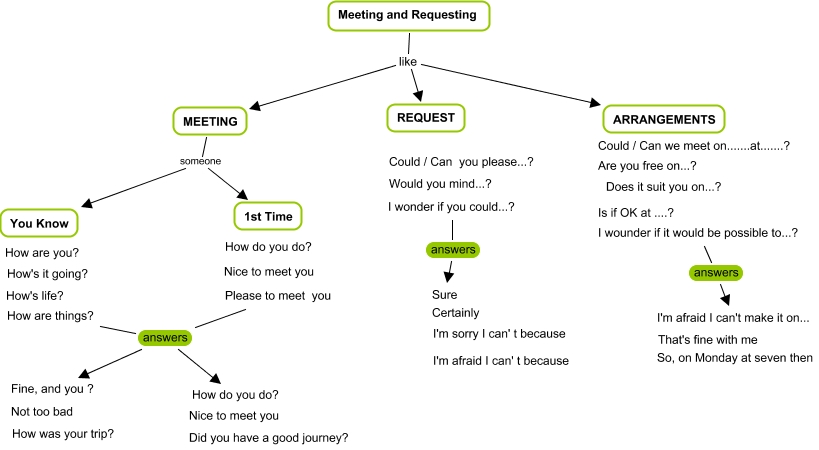 This Concept Map, created with IHMC CmapTools, has information related to: Meeting and requesting, MEETING someone 1st Time, Meeting and Requesting like ARRANGEMENTS, MEETING someone You Know, I wounder if it would be possible to...? answers I'm afraid I can't make it on..., How are things? answers How do you do?, Please to meet you answers How do you do?, I wonder if you could...? answers Sure, Meeting and Requesting like MEETING, Meeting and Requesting like REQUEST, How are things? answers Fine, and you ?, Please to meet you answers Fine, and you ?