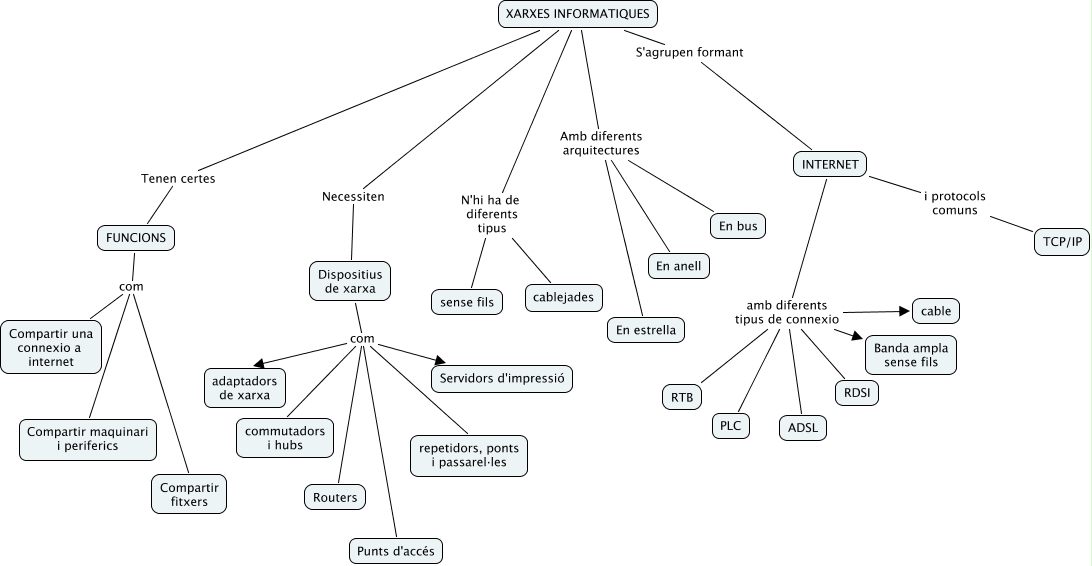 Aquest mapa conceptual conté informació relacionada amb: xarxes_informatiques, XARXES INFORMATIQUES Amb diferents arquitectures En bus, XARXES INFORMATIQUES N'hi ha de diferents tipus cablejades, Dispositius de xarxa com Punts d'accés, INTERNET i protocols comuns TCP/IP, FUNCIONS com Compartir fitxers, XARXES INFORMATIQUES Tenen certes FUNCIONS, INTERNET amb diferents tipus de connexio PLC, INTERNET amb diferents tipus de connexio cable, FUNCIONS com Compartir una connexio a internet, XARXES INFORMATIQUES Necessiten Dispositius de xarxa, FUNCIONS com Compartir maquinari i periferics, XARXES INFORMATIQUES N'hi ha de diferents tipus sense fils, INTERNET amb diferents tipus de connexio RTB, Dispositius de xarxa com repetidors, ponts i passarel·les, XARXES INFORMATIQUES Amb diferents arquitectures En estrella, Dispositius de xarxa com Routers, INTERNET amb diferents tipus de connexio Banda ampla sense fils, INTERNET amb diferents tipus de connexio ADSL, Dispositius de xarxa com Servidors d'impressió, INTERNET amb diferents tipus de connexio RDSI