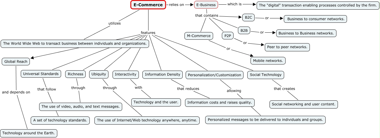 This Concept Map, created with IHMC CmapTools, has information related to: KM1_niehaubm, Personalization/Customization allowing Personalized messages to be delivered to individuals and groups., E-Commerce features Interactivity, Global Reach and depends on Technology around the Earth., E-Commerce relies on E-Business, Information Density that reduces Information costs and raises quality., E-Business that contains B2C, E-Commerce features Social Technology, Interactivity with Technology and the user., Universal Standards that follow A set of technology standards., B2C or Business to consumer networks., M-Commerce or Mobile networks., E-Commerce features Global Reach, E-Business that contains B2B, E-Business which is The "digital" transaction enabling processes controlled by the firm., Ubiquity through The use of Internet/Web technology anywhere, anytime., E-Business that contains M-Commerce, Richness through The use of video, audio, and text messages., E-Commerce features Universal Standards, E-Commerce features Personalization/Customization, E-Commerce features Ubiquity