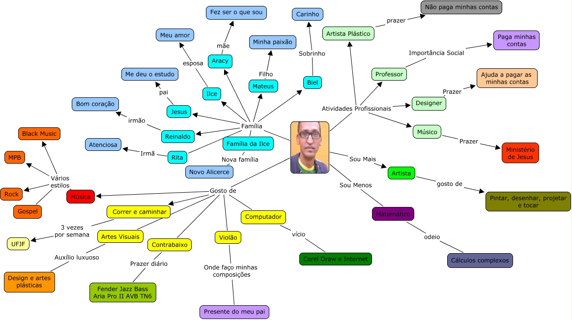 Mapa Luiz, Música Vários estilos MPB, Professor Importância Social Paga minhas contas, Gosto de Música, Família Mateus, Gosto de Correr e caminhar, Artes Visuais Auxílio luxuoso Design e artes plásticas, Família Ilce, Artista gosto de Pintar, desenhar, projetar e tocar, Atividades Profissionais Designer, Família Família da Ilce