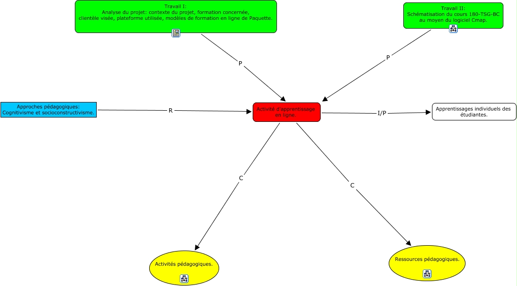 Cette carte conceptuelle, cree avec IHMC CmapTools, contient des informations liees a : Schématisation de l'activité.NSanterre, Travail II: Schématisation du cours 180-TSG-BC au moyen du logiciel Cmap. P Activité d'apprentissage en ligne., Activité d'apprentissage en ligne. C Activités pédagogiques., Activité d'apprentissage en ligne. C Ressources pédagogiques., Travail I: Analyse du projet: contexte du projet, formation concernée, clientèle visée, plateforme utilisée, modèles de formation en ligne de Paquette. P Activité d'apprentissage en ligne., Activité d'apprentissage en ligne. I/P Apprentissages individuels des étudiantes., Approches pédagogiques: Cognitivisme et socioconstructivisme. R Activité d'apprentissage en ligne.