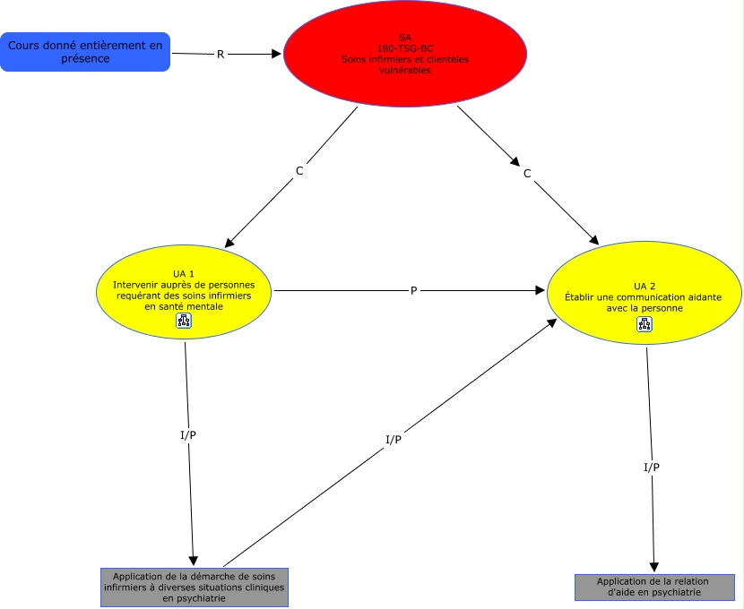 Cette carte conceptuelle, cree avec IHMC CmapTools, contient des informations liees a : SA, Cours donné entièrement en présence R SA 180-TSG-BC Soins infirmiers et clientèles vulnérables, SA 180-TSG-BC Soins infirmiers et clientèles vulnérables C UA 1 Intervenir auprès de personnes requérant des soins infirmiers en santé mentale, UA 1 Intervenir auprès de personnes requérant des soins infirmiers en santé mentale P UA 2 Établir une communication aidante avec la personne, UA 1 Intervenir auprès de personnes requérant des soins infirmiers en santé mentale I/P Application de la démarche de soins infirmiers à diverses situations cliniques en psychiatrie, SA 180-TSG-BC Soins infirmiers et clientèles vulnérables C UA 2 Établir une communication aidante avec la personne, UA 2 Établir une communication aidante avec la personne I/P Application de la relation d'aide en psychiatrie, Application de la démarche de soins infirmiers à diverses situations cliniques en psychiatrie I/P UA 2 Établir une communication aidante avec la personne