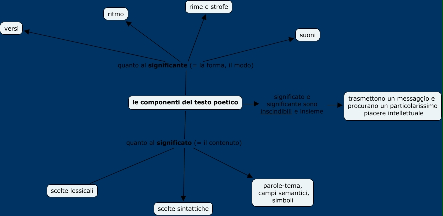 Questa Cmap, creata con IHMC CmapTools, contiene informazioni relative a: il testo poetico_2, le componenti del testo poetico quanto al significante (= la forma, il modo) suoni, le componenti del testo poetico quanto al significato (= il contenuto) scelte lessicali, le componenti del testo poetico quanto al significato (= il contenuto) parole-tema, campi semantici, simboli, le componenti del testo poetico significato e significante sono inscindibili e insieme trasmettono un messaggio e procurano un particolarissimo piacere intellettuale, le componenti del testo poetico quanto al significante (= la forma, il modo) ritmo, le componenti del testo poetico quanto al significante (= la forma, il modo) versi, le componenti del testo poetico quanto al significato (= il contenuto) scelte sintattiche, le componenti del testo poetico quanto al significante (= la forma, il modo) rime e strofe