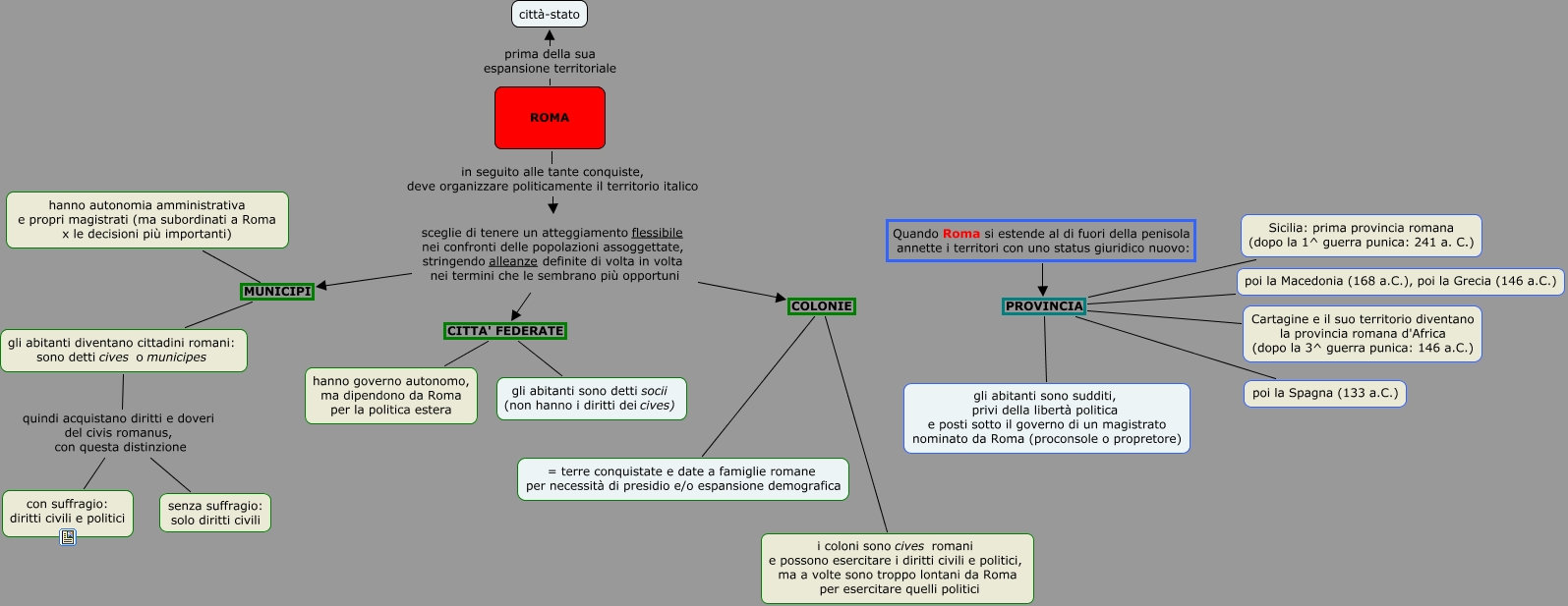 Questa Cmap, creata con IHMC CmapTools, contiene informazioni relative a: l'organizzazione politica dell'Italia romana, Quando Roma si estende al di fuori della penisola annette i territori con uno status giuridico nuovo: PROVINCIA poi la Macedonia (168 a.C.), poi la Grecia (146 a.C.), sceglie di tenere un atteggiamento flessibile nei confronti delle popolazioni assoggettate, stringendo alleanze definite di volta in volta nei termini che le sembrano più opportuni COLONIE i coloni sono cives romani e possono esercitare i diritti civili e politici, ma a volte sono troppo lontani da Roma per esercitare quelli politici, Quando Roma si estende al di fuori della penisola annette i territori con uno status giuridico nuovo: PROVINCIA Cartagine e il suo territorio diventano la provincia romana d'Africa (dopo la 3^ guerra punica: 146 a.C.), Quando Roma si estende al di fuori della penisola annette i territori con uno status giuridico nuovo: PROVINCIA Sicilia: prima provincia romana (dopo la 1^ guerra punica: 241 a. C.), sceglie di tenere un atteggiamento flessibile nei confronti delle popolazioni assoggettate, stringendo alleanze definite di volta in volta nei termini che le sembrano più opportuni MUNICIPI hanno autonomia amministrativa e propri magistrati (ma subordinati a Roma x le decisioni più importanti), ROMA in seguito alle tante conquiste, deve organizzare politicamente il territorio italico sceglie di tenere un atteggiamento flessibile nei confronti delle popolazioni assoggettate, stringendo alleanze definite di volta in volta nei termini che le sembrano più opportuni, sceglie di tenere un atteggiamento flessibile nei confronti delle popolazioni assoggettate, stringendo alleanze definite di volta in volta nei termini che le sembrano più opportuni MUNICIPI gli abitanti diventano cittadini romani: sono detti cives o municipes, ROMA prima della sua espansione territoriale città-stato, gli abitanti diventano cittadini romani: sono detti cives o municipes quindi acquistano diritti e doveri del civis romanus, con questa distinzione senza suffragio: solo diritti civili, Quando Roma si estende al di fuori della penisola annette i territori con uno status giuridico nuovo: PROVINCIA poi la Spagna (133 a.C.), sceglie di tenere un atteggiamento flessibile nei confronti delle popolazioni assoggettate, stringendo alleanze definite di volta in volta nei termini che le sembrano più opportuni COLONIE = terre conquistate e date a famiglie romane per necessità di presidio e/o espansione demografica, sceglie di tenere un atteggiamento flessibile nei confronti delle popolazioni assoggettate, stringendo alleanze definite di volta in volta nei termini che le sembrano più opportuni CITTA' FEDERATE gli abitanti sono detti socii (non hanno i diritti dei cives), sceglie di tenere un atteggiamento flessibile nei confronti delle popolazioni assoggettate, stringendo alleanze definite di volta in volta nei termini che le sembrano più opportuni CITTA' FEDERATE hanno governo autonomo, ma dipendono da Roma per la politica estera, Quando Roma si estende al di fuori della penisola annette i territori con uno status giuridico nuovo: PROVINCIA gli abitanti sono sudditi, privi della libertà politica e posti sotto il governo di un magistrato nominato da Roma (proconsole o propretore), gli abitanti diventano cittadini romani: sono detti cives o municipes quindi acquistano diritti e doveri del civis romanus, con questa distinzione con suffragio: diritti civili e politici