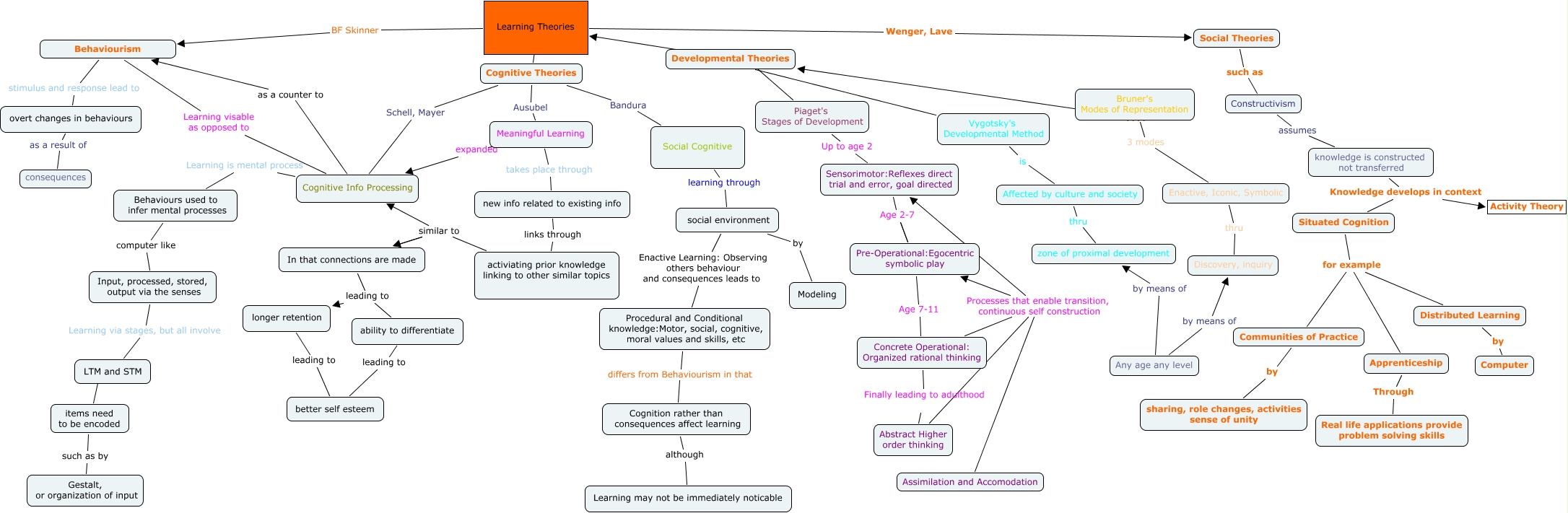 This Concept Map, created with IHMC CmapTools, has information related to: Learning Theories v3, knowledge is constructed not transferred Knowledge develops in context Situated Cognition, Distributed Learning by Computer, In that connections are made leading to longer retention, knowledge is constructed not transferred Knowledge develops in context Activity Theory, Situated Cognition for example Apprenticeship, Cognitive Info Processing Learning is mental process Behaviours used to infer mental processes, Input, processed, stored, output via the senses Learning via stages, but all involve LTM and STM, Behaviours used to infer mental processes computer like Input, processed, stored, output via the senses, Behaviourism stimulus and response lead to overt changes in behaviours, Vygotsky's Developmental Method ???? Developmental Theories, Assimilation and Accomodation Processes that enable transition, continuous self construction Abstract Higher order thinking, Apprenticeship Through Real life applications provide problem solving skills, LTM and STM ???? items need to be encoded, Developmental Theories ???? Learning Theories, Sensorimotor:Reflexes direct trial and error, goal directed Age 2-7 Pre-Operational:Egocentric symbolic play, Assimilation and Accomodation Processes that enable transition, continuous self construction Pre-Operational:Egocentric symbolic play, Behaviourism Learning visable as opposed to Cognitive Info Processing, new info related to existing info links through activiating prior knowledge linking to other similar topics, Bruner's Modes of Representation ???? Developmental Theories, social environment by Modeling