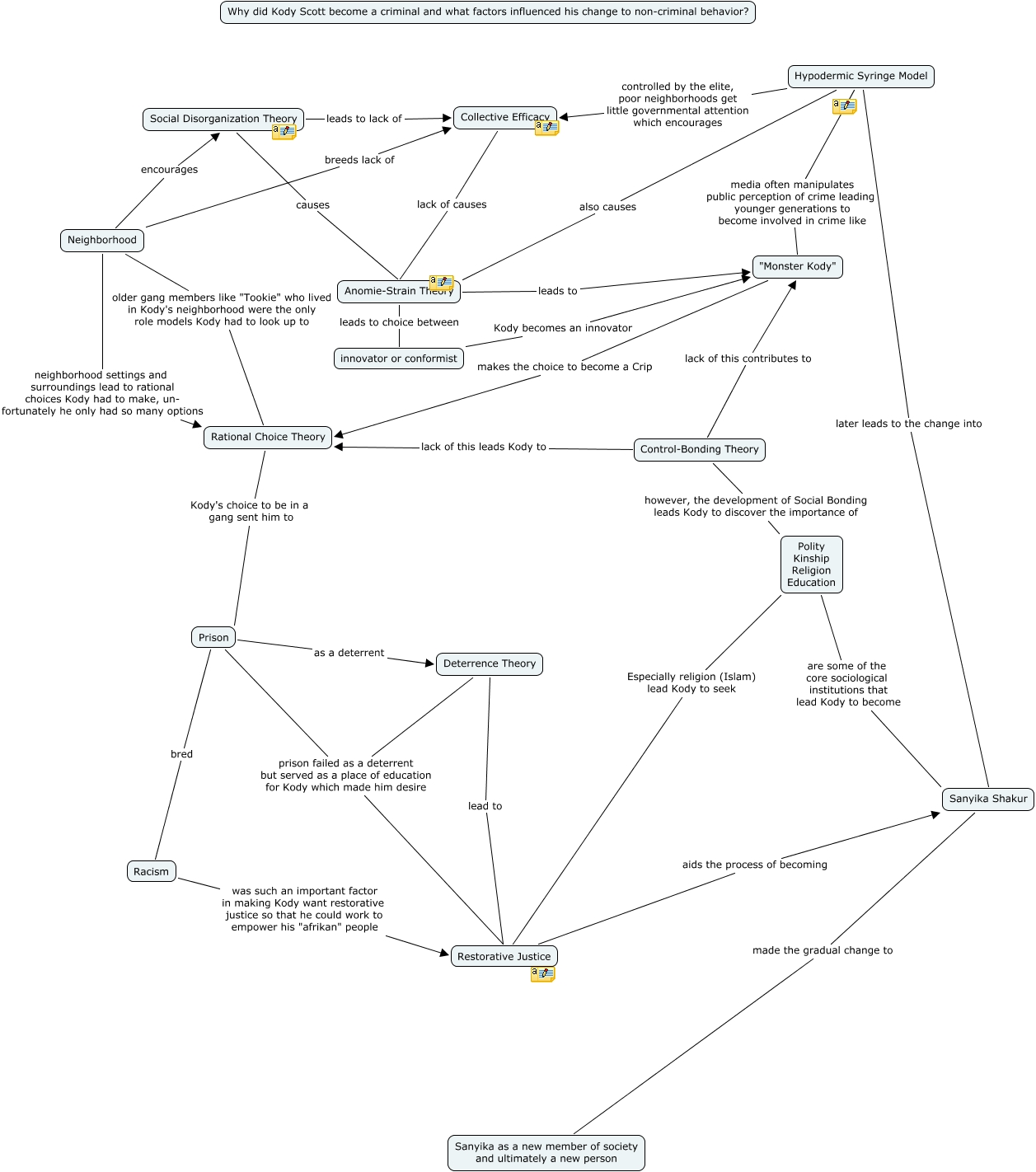 This Concept Map, created with IHMC CmapTools, has information related to: Shuler final c-map, Rational Choice Theory Kody's choice to be in a gang sent him to Prison, Control-Bonding Theory however, the development of Social Bonding leads Kody to discover the importance of Polity Kinship Religion Education, Anomie-Strain Theory leads to choice between innovator or conformist, Polity Kinship Religion Education are some of the core sociological institutions that lead Kody to become Sanyika Shakur, Social Disorganization Theory causes Anomie-Strain Theory, Hypodermic Syringe Model also causes Anomie-Strain Theory, Social Disorganization Theory leads to lack of Collective Efficacy, Prison as a deterrent Deterrence Theory, Sanyika Shakur made the gradual change to Sanyika as a new member of society and ultimately a new person, innovator or conformist Kody becomes an innovator "Monster Kody", Neighborhood encourages Social Disorganization Theory, Collective Efficacy lack of causes Anomie-Strain Theory, "Monster Kody" makes the choice to become a Crip Rational Choice Theory, Prison bred Racism, Deterrence Theory lead to Restorative Justice, Prison prison failed as a deterrent but served as a place of education for Kody which made him desire Restorative Justice, Restorative Justice aids the process of becoming Sanyika Shakur, Neighborhood older gang members like "Tookie" who lived in Kody's neighborhood were the only role models Kody had to look up to Rational Choice Theory, Deterrence Theory prison failed as a deterrent but served as a place of education for Kody which made him desire Restorative Justice, Racism was such an important factor in making Kody want restorative justice so that he could work to empower his "afrikan" people Restorative Justice