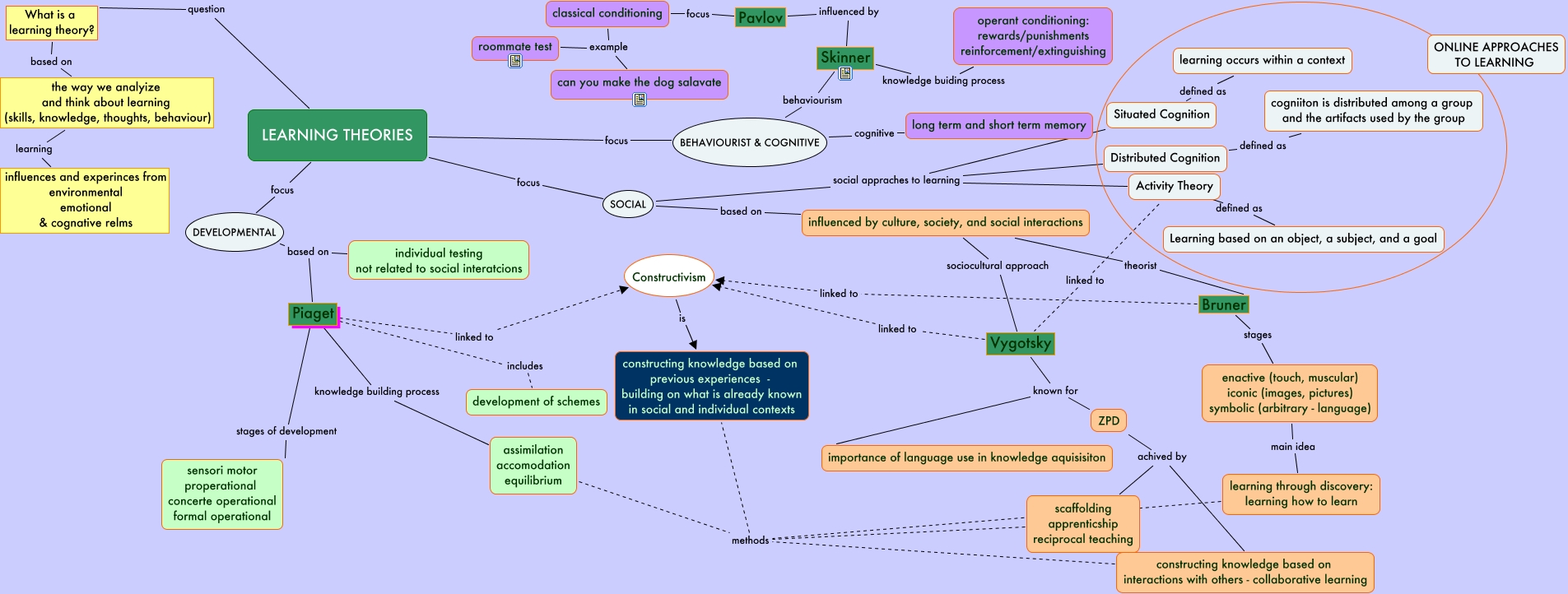 This Concept Map, created with IHMC CmapTools, has information related to: Adi Aharon - Learning Theories-November, Bruner stages enactive (touch, muscular) iconic (images, pictures) symbolic (arbitrary - language), DEVELOPMENTAL based on Piaget, LEARNING THEORIES focus SOCIAL, LEARNING THEORIES question What is a learning theory?, SOCIAL social appraches to learning Activity Theory, BEHAVIOURIST & COGNITIVE behaviourism Skinner, enactive (touch, muscular) iconic (images, pictures) symbolic (arbitrary - language) main idea learning through discovery: learning how to learn, classical conditioning example roommate test, ZPD achived by constructing knowledge based on interactions with others - collaborative learning, Skinner knowledge buiding process operant conditioning: rewards/punishments reinforcement/extinguishing, SOCIAL based on influenced by culture, society, and social interactions, classical conditioning example can you make the dog salavate, Bruner linked to Constructivism, Vygotsky known for ZPD, Pavlov focus classical conditioning, Piaget knowledge building process assimilation accomodation equilibrium, Piaget linked to Constructivism, Distributed Cognition defined as cogniiton is distributed among a group and the artifacts used by the group, assimilation accomodation equilibrium methods constructing knowledge based on previous experiences - building on what is already known in social and individual contexts, scaffolding apprenticship reciprocal teaching methods constructing knowledge based on previous experiences - building on what is already known in social and individual contexts