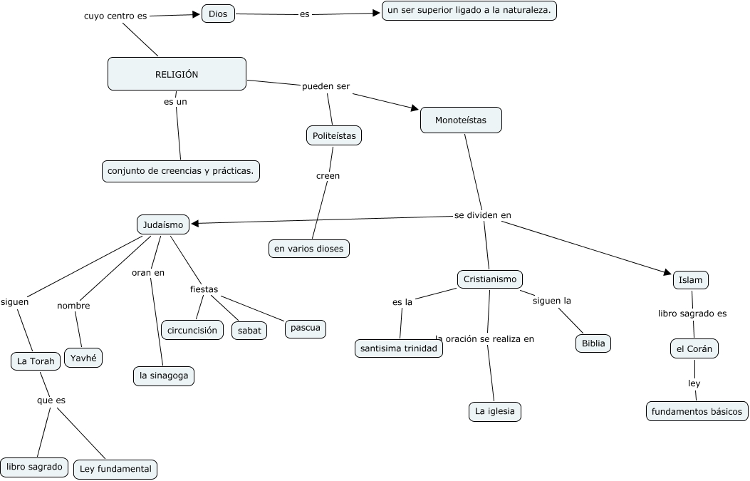 Este Cmap, tiene información relacionada con: Religiones (Carlos y Guillermo P), RELIGIÓN pueden ser Politeístas, Dios es un ser superior ligado a la naturaleza., Judaísmo fiestas sabat, Judaísmo nombre Yavhé, Monoteístas se dividen en Cristianismo, La Torah que es Ley fundamental, La Torah que es libro sagrado, Judaísmo siguen La Torah, RELIGIÓN cuyo centro es Dios, Monoteístas se dividen en Judaísmo, Judaísmo fiestas pascua, Monoteístas se dividen en Islam, RELIGIÓN pueden ser Monoteístas, Cristianismo siguen la Biblia, Politeístas creen en varios dioses, Cristianismo la oración se realiza en La iglesia, el Corán ley fundamentos básicos, Cristianismo es la santisima trinidad, RELIGIÓN es un conjunto de creencias y prácticas., Judaísmo fiestas circuncisión