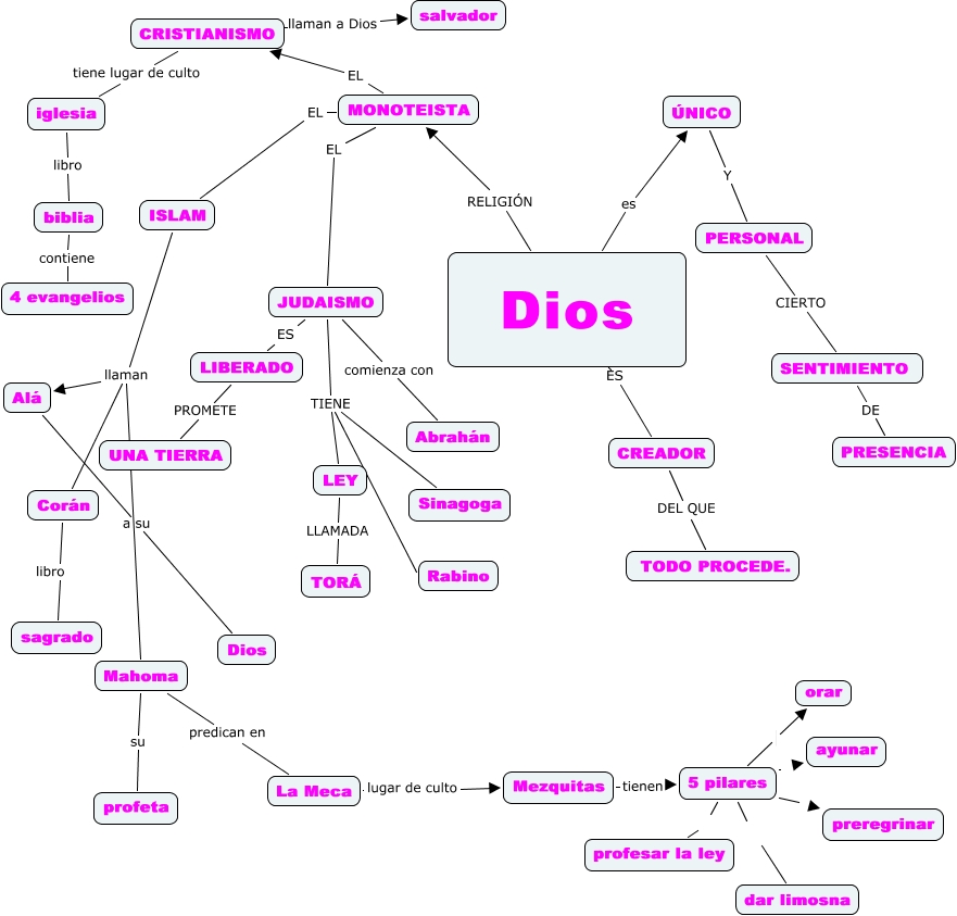Este Cmap, tiene información relacionada con: RELIGIONES (YARA, SARA Y VICTORIA), PERSONAL CIERTO SENTIMIENTO, 5 pilares dar limosna, JUDAISMO TIENE Sinagoga, Mezquitas tienen 5 pilares, Mahoma predican en La Meca, Corán libro sagrado, CREADOR DEL QUE TODO PROCEDE., SENTIMIENTO DE PRESENCIA, biblia contiene 4 evangelios, Mahoma su profeta, MONOTEISTA EL JUDAISMO, JUDAISMO TIENE Rabino, JUDAISMO TIENE LEY, ISLAM llaman Corán, JUDAISMO comienza con Abrahán, Dios ES CREADOR, iglesia libro biblia, Alá a su Dios, 5 pilares ayunar, JUDAISMO ES LIBERADO