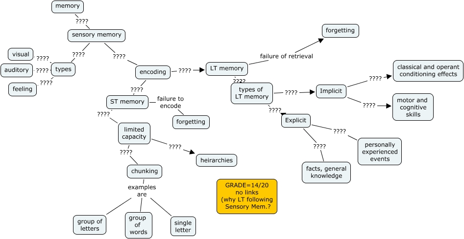 This Concept Map, created with IHMC CmapTools, has information related to: chapter8 Micah Hallman, chunking examples are group of letters, types of LT memory ???? Implicit, types ???? feeling, Explicit ???? personally experienced events, types ???? visual, chunking examples are single letter, types of LT memory ???? Explicit, sensory memory ???? types, memory ???? sensory memory, limited capacity ???? chunking, LT memory failure of retrieval forgetting, ST memory ???? limited capacity, LT memory ???? types of LT memory, Explicit ???? facts, general knowledge, types ???? auditory, encoding ???? LT memory, Implicit ???? classical and operant conditioning effects, chunking examples are group of words, limited capacity ???? heirarchies, sensory memory ???? encoding