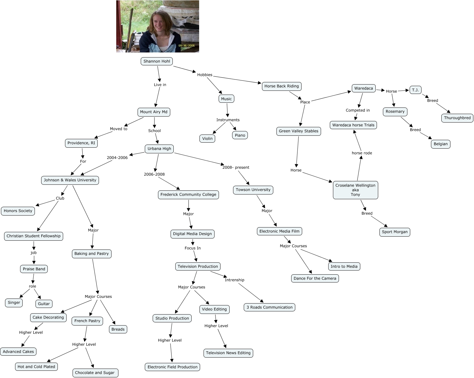 This Concept Map, created with IHMC CmapTools, has information related to: Shohl1, Urbana High 2006-2008 Frederick Community College, Studio Production Higher Level Electronic Field Production, Electronic Media Film Major Courses Intro to Media, Baking and Pastry Major Courses French Pastry, Video Editing Higher Level Television News Editing, Television Production Intrenship 3 Roads Communication, Television Production Major Courses Video Editing, Praise Band role Singer, Electronic Media Film Major Courses Dance For the Camera, Rosemary Breed Belgian, Horse Back Riding Place Waredaca, Croselane Wellington aka Tony Breed Sport Morgan, Praise Band role Guitar, Shannon Hohl Hobbies Horse Back Riding, Mount Airy Md Moved to Providence, RI, Baking and Pastry Major Courses Cake Decorating, T.J. Breed Thuroughbred, Television Production Major Courses Studio Production, Cake Decorating Higher Level Advanced Cakes, French Pastry Higher Level Hot and Cold Plated