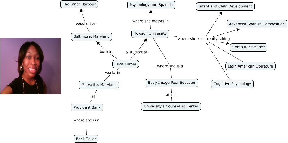 This Concept Map, created with IHMC CmapTools, has information related to: eturne8, Body Image Peer Educator at the University's Counseling Center, Towson University where she is currently taking Cognitive Psychology, Towson University where she is currently taking Computer Science, Towson University where she is a Body Image Peer Educator, Pikesville, Maryland at Provident Bank, Towson University where she is currently taking Advanced Spanish Composition, Baltimore, Maryland popular for The Inner Harbour, Towson University where she majors in Psychology and Spanish, Erica Turner born in Baltimore, Maryland, Erica Turner a student at Towson University, Provident Bank where she is a Bank Teller, Towson University where she is currently taking Infant and Child Development, Towson University where she is currently taking Latin American Literature, Erica Turner works in Pikesville, Maryland