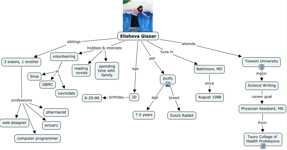 This Concept Map, created with IHMC CmapTools, has information related to: Elisheva Glazer--Information Page, Science Writing career goal Physician Assistant, MS, volunteering at GBMC, 3 sisters, 1 brother professions actuary, Elisheva Glazer pet Sniffy, Sniffy age 7.5 years, Elisheva Glazer hobbies & interests volunteering, Towson University major Science Writing, Baltimore, MD since August 1988, 3 sisters, 1 brother professions web designer, Sniffy breed Dutch Rabbit, 20 birthday 8-29-88, 3 sisters, 1 brother professions pharmacist, Elisheva Glazer attends Towson University, Elisheva Glazer lives in Baltimore, MD, 3 sisters, 1 brother professions computer programmer, Elisheva Glazer hobbies & interests reading novels, volunteering at Levindale, Physician Assistant, MS from Touro College of Health Professions, Elisheva Glazer hobbies & interests spending time with family, Elisheva Glazer siblings 3 sisters, 1 brother