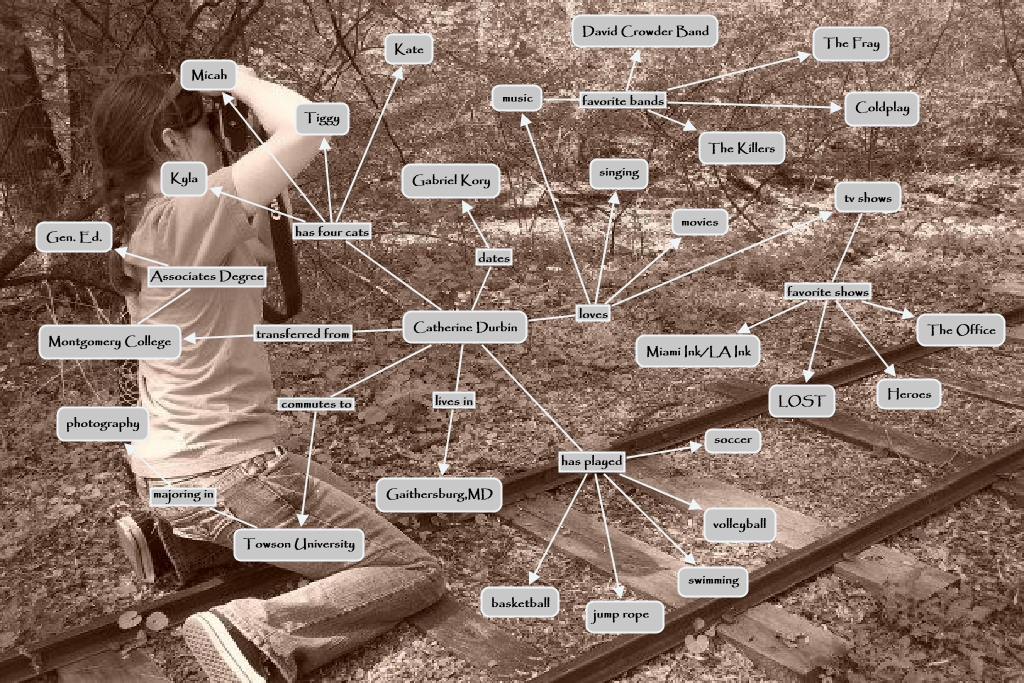 This Concept Map, created with IHMC CmapTools, has information related to: Catherine Durbin cmap, Catherine Durbin has played volleyball, Catherine Durbin has played soccer, Towson University majoring in photography, Catherine Durbin has played swimming, tv shows favorite shows Heroes, Catherine Durbin lives in Gaithersburg,MD, tv shows favorite shows The Office, Catherine Durbin has four cats Tiggy, Catherine Durbin loves movies, music favorite bands The Fray, Montgomery College Associates Degree Gen. Ed., Catherine Durbin has four cats Micah, music favorite bands The Killers, tv shows favorite shows LOST, Catherine Durbin commutes to Towson University, Catherine Durbin has played jump rope, music favorite bands Coldplay, tv shows favorite shows Miami Ink/LA Ink, Catherine Durbin transferred from Montgomery College, Catherine Durbin dates Gabriel Kory