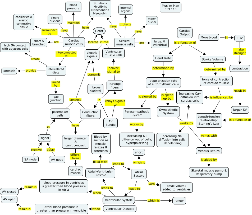 This Concept Map, created with IHMC CmapTools, has information related to: heart, Ventricular Systole when blood pressure in ventricles is greater than blood pressure in Atria, depolarization rate of autorhythmic cells is speed up by Sympathetic System, Stroke Volume determined by force of contraction of cardiac muscle, Purkinje fibers in Conduction fibers, Atrial blood pressure is greater than pressure in ventricle result in AV open, Length-tension relationship: Starling's Law varies with Venous Return, Ventricular Systole leads to Atrial-Ventricular Diastole, SA node receive signal, signal in pacemaker cells, Ventricular Diastole when Atrial blood pressure is greater than pressure in ventricle, Sympathetic System works by Venous Return, Conduction fibers have larger diameter & can't contract, force of contraction of cardiac muscle is influenced by Length-tension relationship: Starling's Law, AV Bundle in Conduction fibers, More blood in EDV, force of contraction of cardiac muscle is influenced by Increasing Ca+ diffusion into cardiac cells, EDV make stronger contraction, contraction result in larger SV, Heart Rate determined by depolarization rate of autorhythmic cells, Atrial Systole which is short