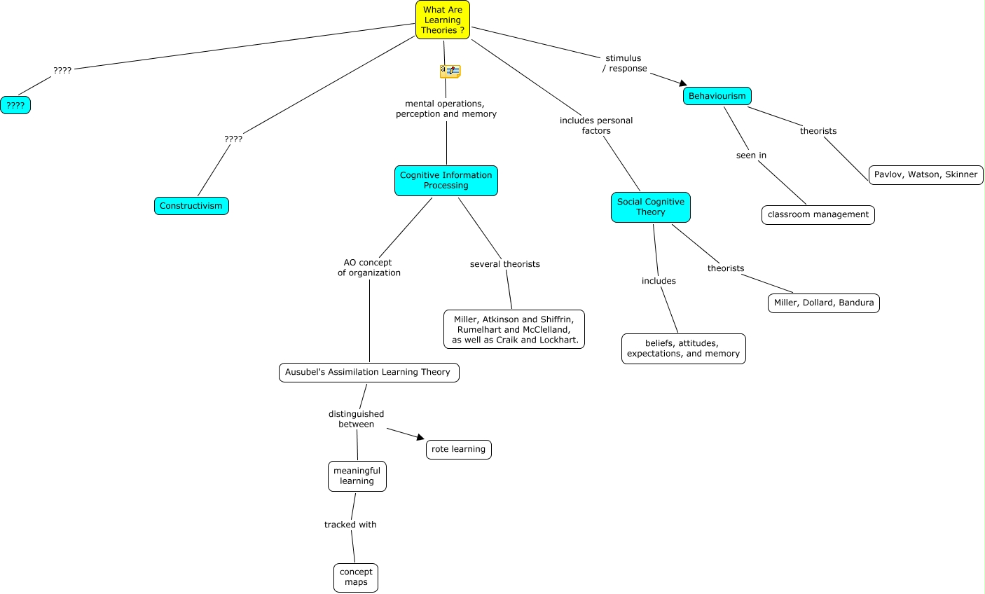 This Concept Map, created with IHMC CmapTools, has information related to: Korpan_workingdraft_512, Cognitive Information Processing AO concept of organization Ausubel's Assimilation Learning Theory, What Are Learning Theories ? ???? Constructivism, Cognitive Information Processing several theorists Miller, Atkinson and Shiffrin, Rumelhart and McClelland, as well as Craik and Lockhart., What Are Learning Theories ? ???? ????, What Are Learning Theories ? includes personal factors Social Cognitive Theory, Social Cognitive Theory theorists Miller, Dollard, Bandura, Social Cognitive Theory includes beliefs, attitudes, expectations, and memory, Ausubel's Assimilation Learning Theory distinguished between rote learning, Behaviourism theorists Pavlov, Watson, Skinner, What Are Learning Theories ? stimulus / response Behaviourism, meaningful learning tracked with concept maps, Behaviourism seen in classroom management, Ausubel's Assimilation Learning Theory distinguished between meaningful learning, What Are Learning Theories ? mental operations, perception and memory Cognitive Information Processing