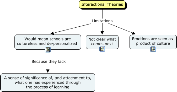 This Concept Map, created with IHMC CmapTools, has information related to: Limitations of Interactional Theories, Interactional Theories Limitations Emotions are seen as product of culture, Interactional Theories Limitations Would mean schools are cultureless and de-personalized, Interactional Theories Limitations Not clear what comes next, Would mean schools are cultureless and de-personalized Because they lack A sense of significance of, and attachment to, what one has experienced through the process of learning