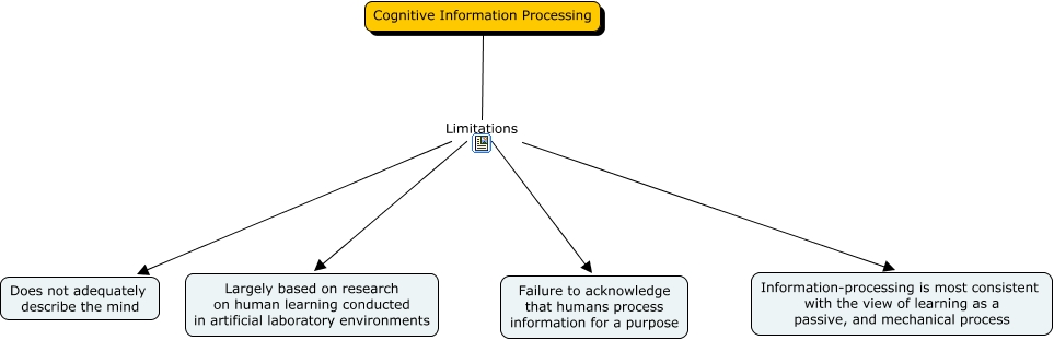 This Concept Map, created with IHMC CmapTools, has information related to: Limitations of Cognitive Information Processing, Cognitive Information Processing Limitations Does not adequately describe the mind, Cognitive Information Processing Limitations Information-processing is most consistent with the view of learning as a passive, and mechanical process, Cognitive Information Processing Limitations Largely based on research on human learning conducted in artificial laboratory environments, Cognitive Information Processing Limitations Failure to acknowledge that humans process information for a purpose