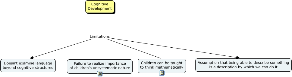 This Concept Map, created with IHMC CmapTools, has information related to: Limitations of Cognitive Development, Cognitive Development Limitations Doesn't examine language beyond cognitive structures, Cognitive Development Limitations Failure to realize importance of children's unsystematic nature, Cognitive Development Limitations Children can be taught to think mathematically, Cognitive Development Limitations Assumption that being able to describe something is a description by which we can do it
