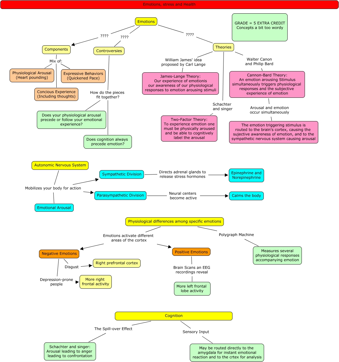 This Concept Map, created with IHMC CmapTools, has information related to: Jennifer Giglio-Ch.11 Emotions and Stress, Autonomic Nervous System Mobilizes your body for action Emotional Arousal, Components Mix of: Concious Experience (Including thoughts), Controversies How do the pieces fit together? Does your physiological arousal precede or follow your emotional experience?, Emotions ???? Controversies, Emotions ???? Theories, Sympathetic Division Directs adrenal glands to release stress hormones Epinephrine and Norepinephrine, Autonomic Nervous System Mobilizes your body for action Parasympathetic Division, Components Mix of: Physiological Arousal (Heart pounding), Physiological differences among specific emotions Emotions activate different areas of the cortex Negative Emotions, Theories Schachter and singer Two-Factor Theory: To experience emotion one must be physically aroused and be able to cognitively label the arousal, Cannon-Bard Theory: An emotion arousing Stimulus simultaneously triggers physiological responses and the subjective experience of emotion Arousal and emotion occur simultaneously The emotion triggering stimulus is routed to the brain's cortex, causing the sujective awareness of emotion, and to the sympathetic nervous system causing arousal, Parasympathetic Division Neural centers become active Calms the body, Autonomic Nervous System Mobilizes your body for action Sympathetic Division, Theories Walter Canon and Philip Bard Cannon-Bard Theory: An emotion arousing Stimulus simultaneously triggers physiological responses and the subjective experience of emotion, Negative Emotions Depression-prone people More right frontal activity, Cognition Sensory Input May be routed directly to the amygdala for instant emotional reaction and to the crtex for analysis, Cognition The Spill-over Effect Schachter and singer: Arousal leading to anger leading to confrontation, Negative Emotions Disgust Right prefrontal cortex, Physiological differences among specific emotions Polygraph Machine Measures several physiological responses accompanying emotion, Emotions ???? Components
