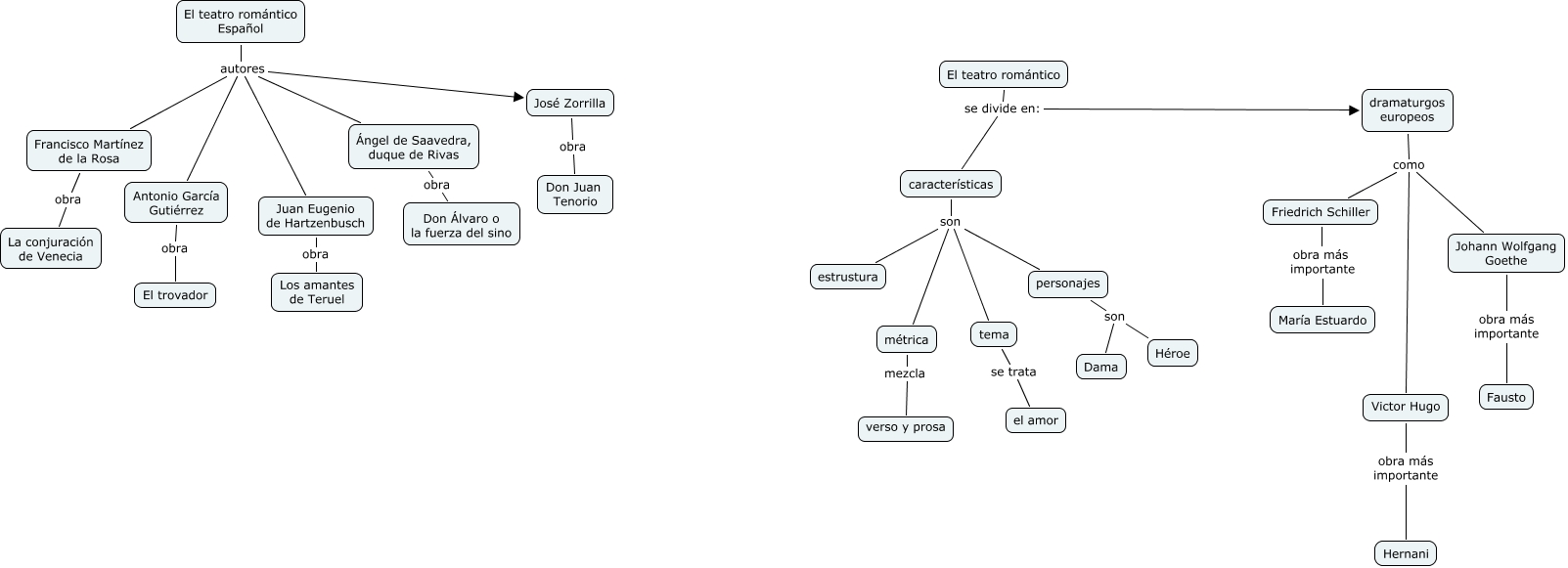 Este Cmap, tiene información relacionada con: lengua literatura cristina aragón solano 4ºB, Victor Hugo obra más importante Hernani, personajes son Héroe, Ángel de Saavedra, duque de Rivas obra Don Álvaro o la fuerza del sino, dramaturgos europeos como Friedrich Schiller, Friedrich Schiller obra más importante María Estuardo, El teatro romántico Español autores Ángel de Saavedra, duque de Rivas, El teatro romántico se divide en: características, Juan Eugenio de Hartzenbusch obra Los amantes de Teruel, El teatro romántico Español autores José Zorrilla, características son métrica, El teatro romántico Español autores Juan Eugenio de Hartzenbusch, tema se trata el amor, Johann Wolfgang Goethe obra más importante Fausto, El teatro romántico Español autores Antonio García Gutiérrez, El teatro romántico se divide en: dramaturgos europeos, El teatro romántico Español autores Francisco Martínez de la Rosa, Antonio García Gutiérrez obra El trovador, métrica mezcla verso y prosa, características son estrustura, Francisco Martínez de la Rosa obra La conjuración de Venecia