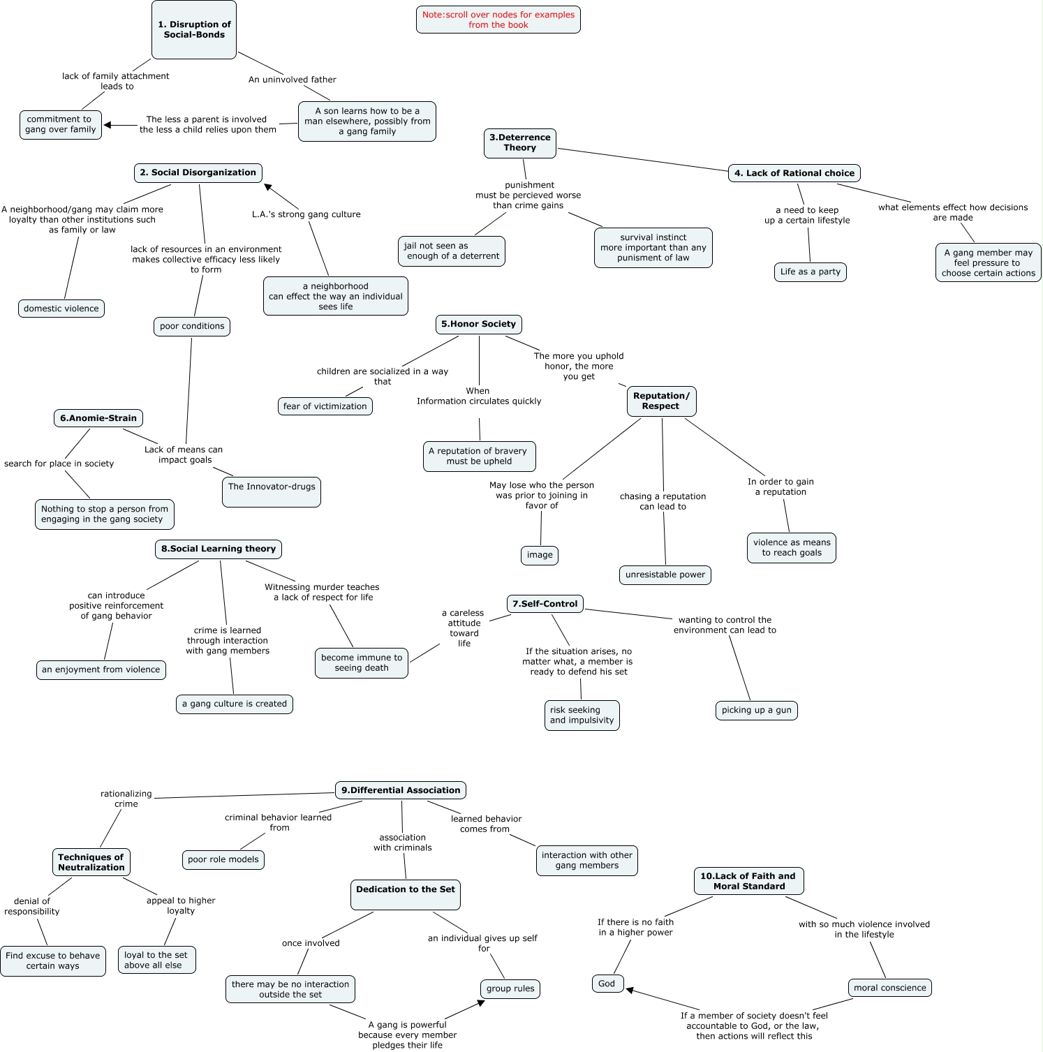 This Concept Map, created with IHMC CmapTools, has information related to: monsterfinal, 6.Anomie-Strain Lack of means can impact goals The Innovator-drugs, 7.Self-Control a careless attitude toward life become immune to seeing death, 8.Social Learning theory can introduce positive reinforcement of gang behavior an enjoyment from violence, Reputation/ Respect chasing a reputation can lead to unresistable power, moral conscience If a member of society doesn't feel accountable to God, or the law, then actions will reflect this God, 10.Lack of Faith and Moral Standard If there is no faith in a higher power God, 8.Social Learning theory Witnessing murder teaches a lack of respect for life become immune to seeing death, 2. Social Disorganization A neighborhood/gang may claim more loyalty than other institutions such as family or law domestic violence, 5.Honor Society children are socialized in a way that fear of victimization, 9.Differential Association association with criminals Dedication to the Set, Techniques of Neutralization appeal to higher loyalty loyal to the set above all else, there may be no interaction outside the set A gang is powerful because every member pledges their life group rules, 4. Lack of Rational choice what elements effect how decisions are made A gang member may feel pressure to choose certain actions, 5.Honor Society The more you uphold honor, the more you get Reputation/ Respect, 1. Disruption of Social-Bonds An uninvolved father A son learns how to be a man elsewhere, possibly from a gang family, 10.Lack of Faith and Moral Standard with so much violence involved in the lifestyle moral conscience, 3.Deterrence Theory punishment must be percieved worse than crime gains survival instinct more important than any punisment of law, Reputation/ Respect May lose who the person was prior to joining in favor of image, 9.Differential Association criminal behavior learned from poor role models, 7.Self-Control If the situation arises, no matter what, a member is ready to defend his set risk seeking and impulsivity