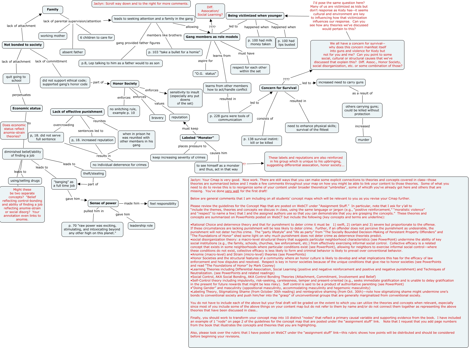 This Concept Map, created with IHMC CmapTools, has information related to: Monster Concept Map, Sense of power gave him leadership role, Being victimized when younger led to Gang members as role models, Family lack of parental supervision/attention leads to seeking attention and a family in the gang, leads to seeking attention and a family in the gang allowing Gang members as role models, Not bonded to society lack of attachment quit going to school, diminished belief/ability of finding a job leads to theft/stealing, Family lack of parental supervision/attention absent father, p. 228 guns were tools of communication led to Concern for Survival, Labeled "Monster" causes him to see himself as a monster and thus, act in that way, Labeled "Monster" places pressure to keep increasing severity of crimes, to see himself as a monster and thus, act in that way ???? These labels and reputations are also reinforced in his group which is unique to his upbringing, suggesting differential assocation, honor society..., Labeled "Monster" must keep reputation, Concern for Survival consists of p. 138 survival instint: kill or be killed, Family lack of parental supervision/attention working mother, others carrying guns; could be killed without protection increased murder, Sense of power made him feel responsiblity, when in prison he was reunited with other members in his gang results in no individual deterrence for crimes, Being victimized when younger happened when p. 100 had lips busted, Concern for Survival ???? We all have a concern for survival-- why does this concern manifest itself into guns and violence for Kody but not for you and me? Can you point to some social, cultural or structural causes that we've discussed that explain this? Diff. Assoc., Honor Society, social disorganization, etc. or some combination of those?, We all have a concern for survival-- why does this concern manifest itself into guns and violence for Kody but not for you and me? Can you point to some social, cultural or structural causes that we've discussed that explain this? Diff. Assoc., Honor Society, social disorganization, etc. or some combination of those? I'd pose the same question here? Many of us are victimized as kids but don't response as Kody has--it seems cultural and environment are key to influencing how that victimization influences our response. Can you see how any theories we've discussed would pertain to this? Being victimized when younger