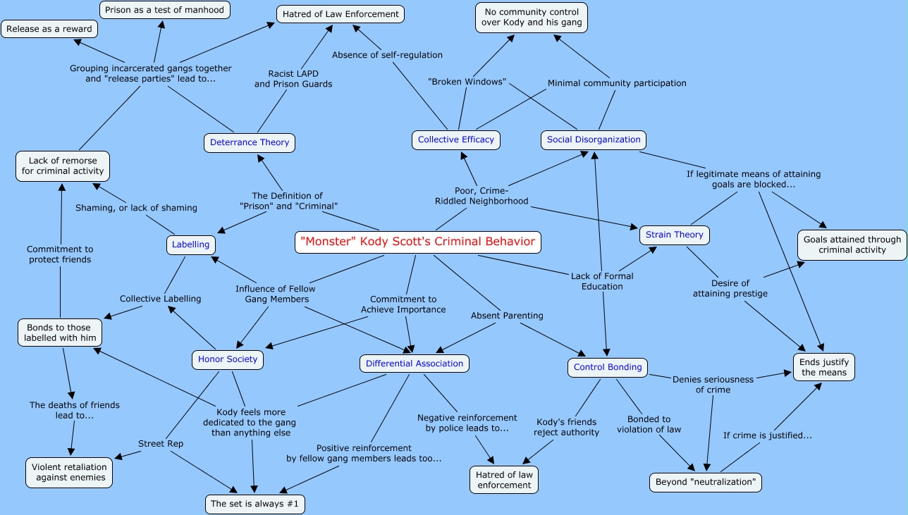 This Concept Map, created with IHMC CmapTools, has information related to: Final Monster Map, "Monster" Kody Scott's Criminal Behavior Poor, Crime- Riddled Neighborhood Collective Efficacy, Bonds to those labelled with him The deaths of friends lead to... Violent retaliation against enemies, Labelling Shaming, or lack of shaming Lack of remorse for criminal activity, Deterrance Theory Grouping incarcerated gangs together and "release parties" lead to... Prison as a test of manhood, Social Disorganization Minimal community participation No community control over Kody and his gang, Social Disorganization If legitimate means of attaining goals are blocked... Goals attained through criminal activity, "Monster" Kody Scott's Criminal Behavior The Definition of "Prison" and "Criminal" Labelling, Deterrance Theory Racist LAPD and Prison Guards Hatred of Law Enforcement, Differential Association Kody feels more dedicated to the gang than anything else The set is always #1, Deterrance Theory Grouping incarcerated gangs together and "release parties" lead to... Lack of remorse for criminal activity, Strain Theory Desire of attaining prestige Ends justify the means, Beyond "neutralization" If crime is justified... Ends justify the means, Control Bonding Kody's friends reject authority Hatred of law enforcement, Honor Society Collective Labelling Bonds to those labelled with him, "Monster" Kody Scott's Criminal Behavior Commitment to Achieve Importance Differential Association, Differential Association Positive reinforcement by fellow gang members leads too... The set is always #1, Control Bonding Denies seriousness of crime Ends justify the means, Differential Association Negative reinforcement by police leads to... Hatred of law enforcement, Labelling Collective Labelling Bonds to those labelled with him, "Monster" Kody Scott's Criminal Behavior Influence of Fellow Gang Members Differential Association