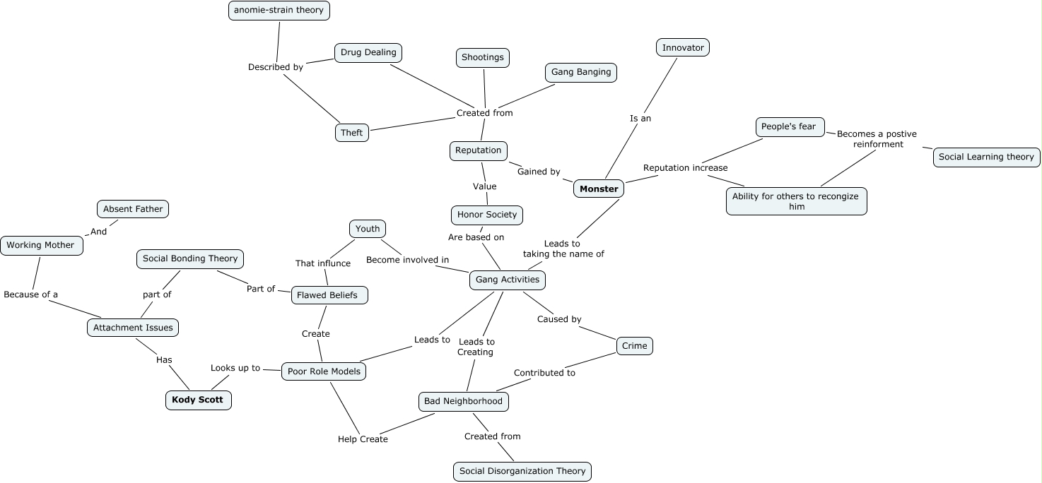 This Concept Map, created with IHMC CmapTools, has information related to: Monster, Poor Role Models Help Create Bad Neighborhood, Monster Gained by Reputation, Reputation Created from Drug Dealing, Crime Contributed to Bad Neighborhood, Monster Reputation increase Ability for others to recongize him, Kody Scott Has Attachment Issues, Attachment Issues part of Social Bonding Theory, Crime Caused by Gang Activities, Monster Reputation increase People's fear, Youth Become involved in Gang Activities, Kody Scott Looks up to Poor Role Models, Flawed Beliefs That influnce Youth, Flawed Beliefs Part of Social Bonding Theory, Monster Is an Innovator, Drug Dealing Described by anomie-strain theory, Working Mother And Absent Father, Reputation Created from Gang Banging, Ability for others to recongize him Becomes a postive reinforment Social Learning theory, Poor Role Models Leads to Gang Activities, Theft Described by anomie-strain theory
