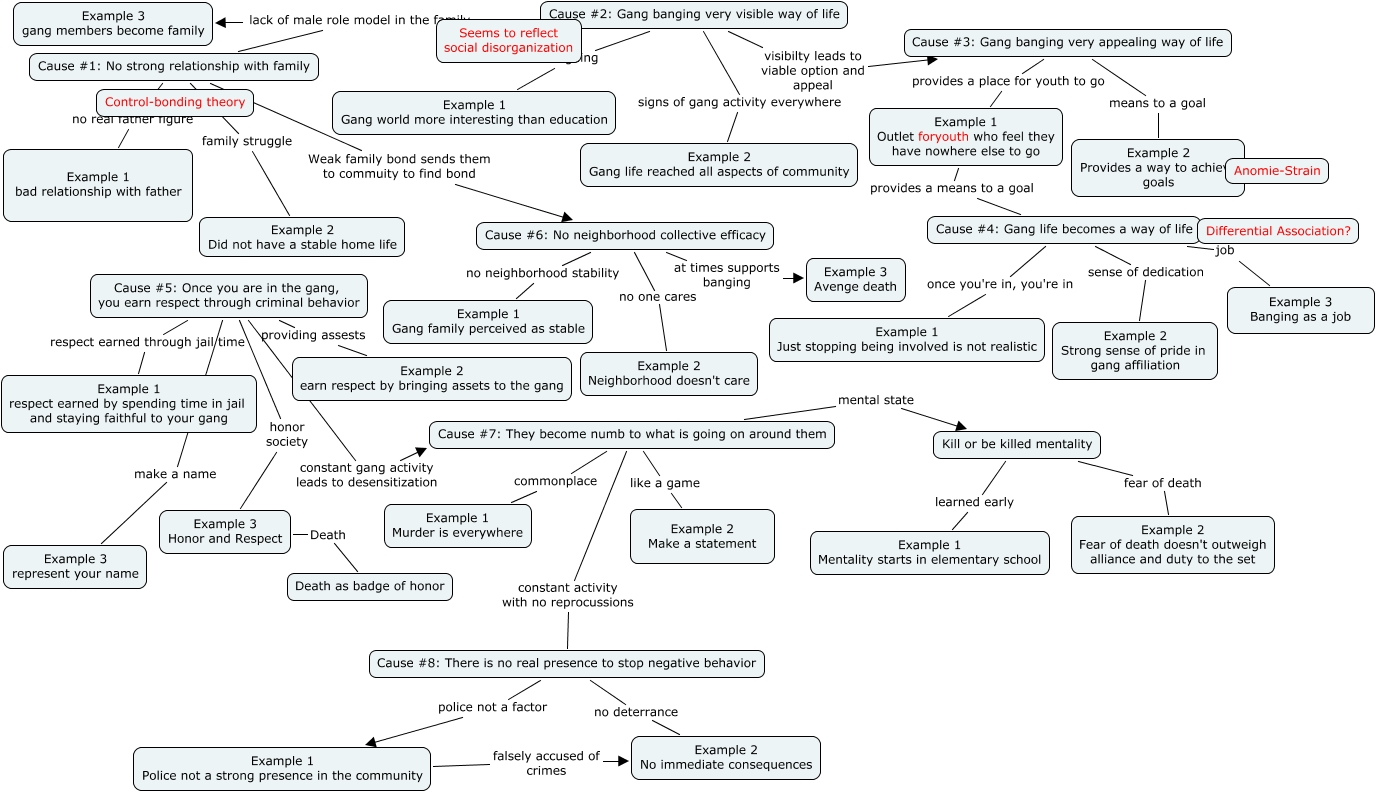 This Concept Map, created with IHMC CmapTools, has information related to: Monster, Cause #1: No strong relationship with family no real father figure Example 1 bad relationship with father, Cause #6: No neighborhood collective efficacy no one cares Example 2 Neighborhood doesn't care, Cause #4: Gang life becomes a way of life sense of dedication Example 2 Strong sense of pride in gang affiliation, Kill or be killed mentality learned early Example 1 Mentality starts in elementary school, Cause #5: Once you are in the gang, you earn respect through criminal behavior constant gang activity leads to desensitization Cause #7: They become numb to what is going on around them, Cause #7: They become numb to what is going on around them constant activity with no reprocussions Cause #8: There is no real presence to stop negative behavior, Cause #5: Once you are in the gang, you earn respect through criminal behavior make a name Example 3 represent your name, Cause #6: No neighborhood collective efficacy at times supports banging Example 3 Avenge death, Cause #3: Gang banging very appealing way of life provides a place for youth to go Example 1 Outlet foryouth who feel they have nowhere else to go, Example 3 Honor and Respect Death Death as badge of honor, Cause #8: There is no real presence to stop negative behavior no deterrance Example 2 No immediate consequences, Cause #8: There is no real presence to stop negative behavior police not a factor Example 1 Police not a strong presence in the community, Cause #2: Gang banging very visible way of life intriguing Example 1 Gang world more interesting than education, Cause #5: Once you are in the gang, you earn respect through criminal behavior respect earned through jail time Example 1 respect earned by spending time in jail and staying faithful to your gang, Cause #4: Gang life becomes a way of life job Example 3 Banging as a job, Cause #5: Once you are in the gang, you earn respect through criminal behavior providing assests Example 2 earn respect by bringing assets to the gang, Cause #7: They become numb to what is going on around them commonplace Example 1 Murder is everywhere, Cause #7: They become numb to what is going on around them mental state Kill or be killed mentality, Cause #2: Gang banging very visible way of life visibilty leads to viable option and appeal Cause #3: Gang banging very appealing way of life, Cause #3: Gang banging very appealing way of life means to a goal Example 2 Provides a way to achieve goals