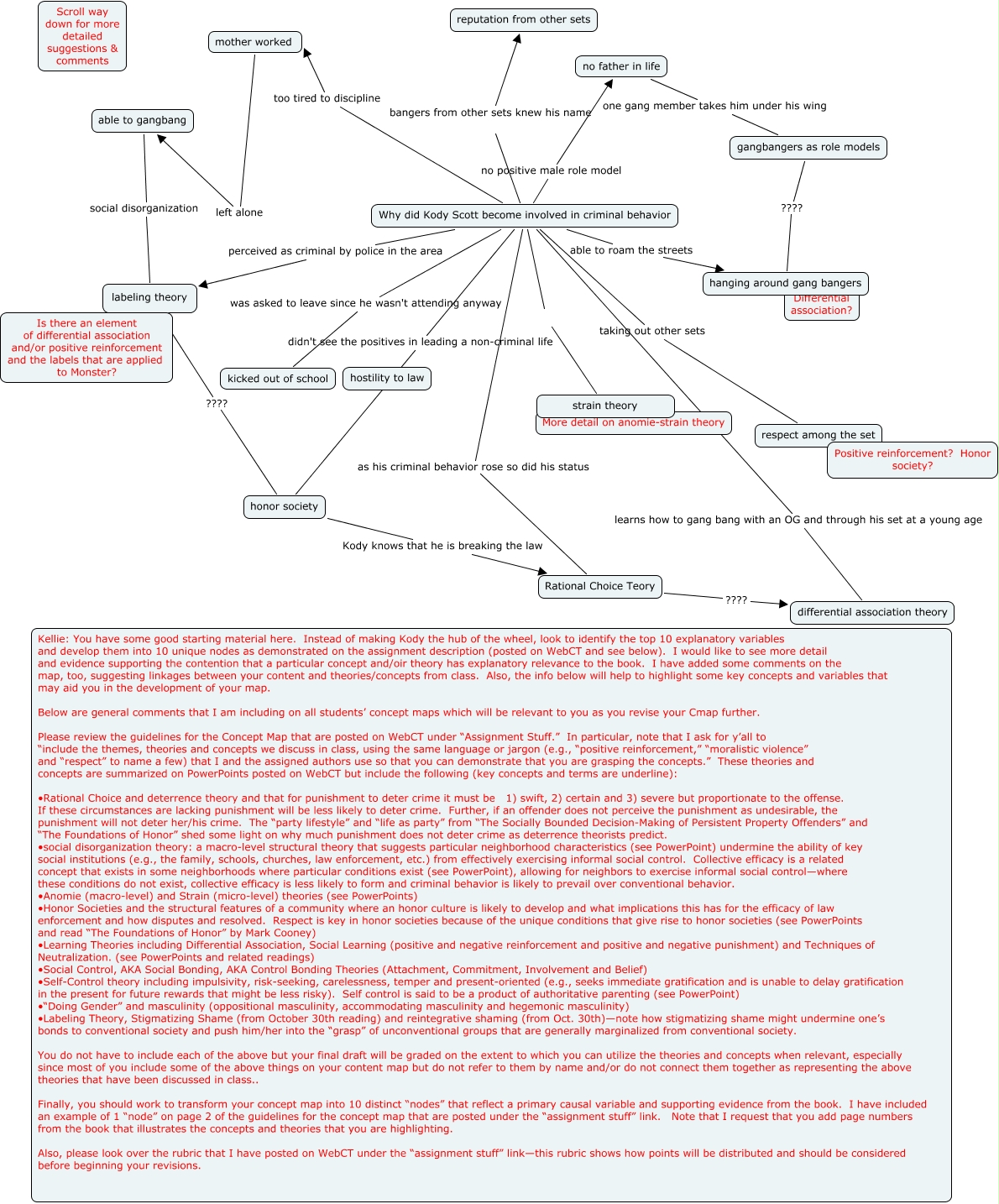 This Concept Map, created with IHMC CmapTools, has information related to: beginnings of final draft, Why did Kody Scott become involved in criminal behavior strain theory, honor society Kody knows that he is breaking the law Rational Choice Teory, labeling theory ???? honor society, Why did Kody Scott become involved in criminal behavior didn't see the positives in leading a non-criminal life honor society, Why did Kody Scott become involved in criminal behavior bangers from other sets knew his name reputation from other sets, Why did Kody Scott become involved in criminal behavior taking out other sets respect among the set, Why did Kody Scott become involved in criminal behavior able to roam the streets hanging around gang bangers, Rational Choice Teory ???? differential association theory, Why did Kody Scott become involved in criminal behavior as his criminal behavior rose so did his status Rational Choice Teory, Why did Kody Scott become involved in criminal behavior learns how to gang bang with an OG and through his set at a young age differential association theory, Why did Kody Scott become involved in criminal behavior too tired to discipline mother worked, able to gangbang social disorganization labeling theory, Why did Kody Scott become involved in criminal behavior was asked to leave since he wasn't attending anyway kicked out of school, Why did Kody Scott become involved in criminal behavior no positive male role model no father in life, gangbangers as role models ???? hanging around gang bangers, Why did Kody Scott become involved in criminal behavior perceived as criminal by police in the area labeling theory, mother worked left alone able to gangbang, no father in life one gang member takes him under his wing gangbangers as role models