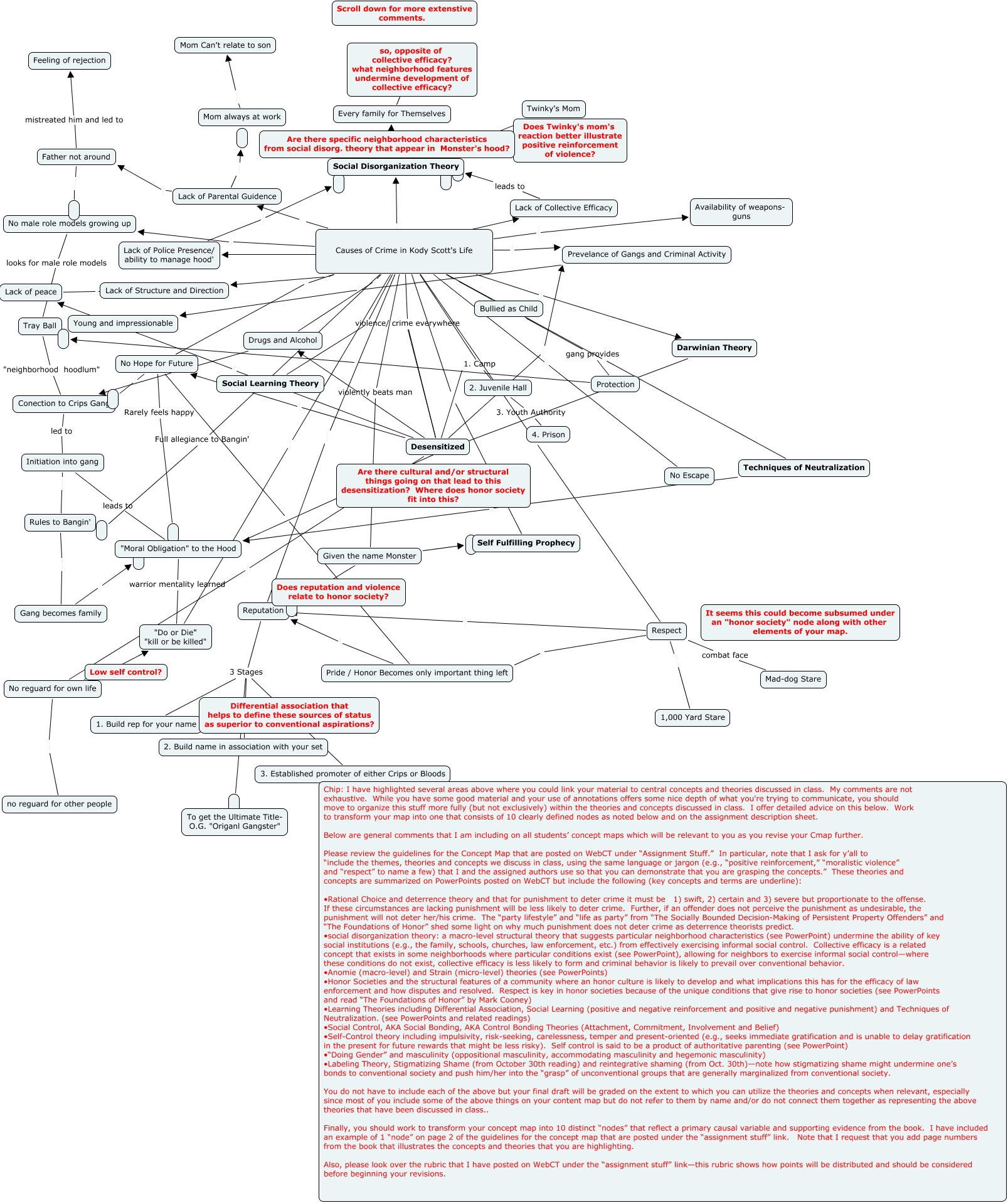 This Concept Map, created with IHMC CmapTools, has information related to: Kody Scott- Monster, Causes of Crime in Kody Scott's Life Drugs and Alcohol, Every family for Themselves ???? so, opposite of collective efficacy? what neighborhood features undermine development of collective efficacy?, Causes of Crime in Kody Scott's Life ???? Lack of Police Presence/ ability to manage hood', No Hope for Future Pride / Honor Becomes only important thing left, Respect Pride / Honor Becomes only important thing left, Causes of Crime in Kody Scott's Life Darwinian Theory, Causes of Crime in Kody Scott's Life Techniques of Neutralization, Given the name Monster, Social Disorganization Theory ???? Every family for Themselves, Lack of peace Lack of Structure and Direction, Initiation into gang leads to "Moral Obligation" to the Hood, Causes of Crime in Kody Scott's Life Respect, Causes of Crime in Kody Scott's Life Social Disorganization Theory, Causes of Crime in Kody Scott's Life Availability of weapons- guns, Causes of Crime in Kody Scott's Life Lack of Structure and Direction, Causes of Crime in Kody Scott's Life No Hope for Future, Drugs and Alcohol Conection to Crips Gang, Reputation 3 Stages 3. Established promoter of either Crips or Bloods, Pride / Honor Becomes only important thing left Reputation, Causes of Crime in Kody Scott's Life Bullied as Child