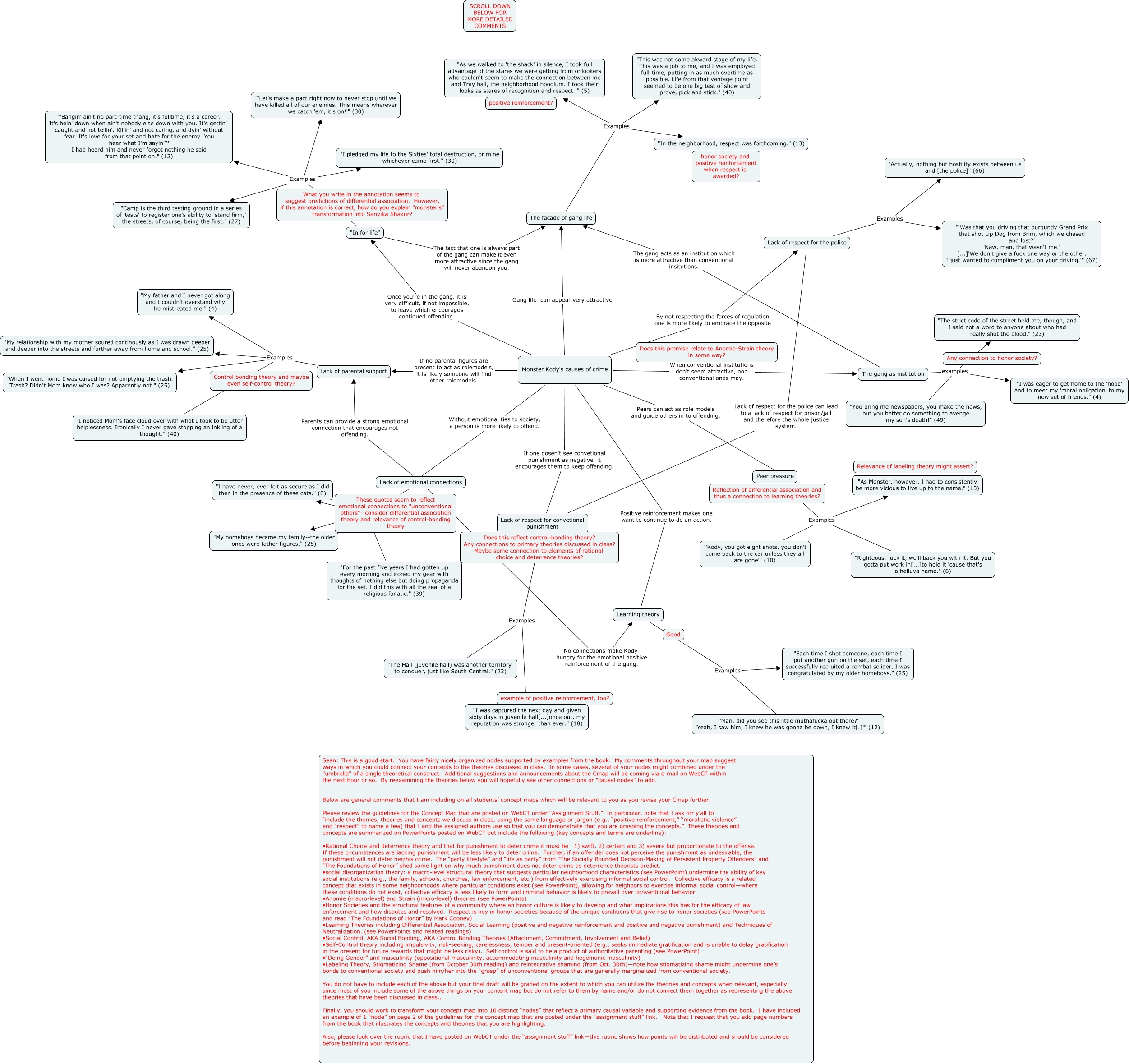 This Concept Map, created with IHMC CmapTools, has information related to: Monster-Sean Briggs, The facade of gang life Examples "This was not some akward stage of my life. This was a job to me, and I was employed full-time, putting in as much overtime as possible. Life from that vantage point seemed to be one big test of show and prove, pick and stick." (40), Lack of parental support Examples "My father and I never got along and I couldn't overstand why he mistreated me." (4), Lack of parental support Examples "I noticed Mom's face cloud over with what I took to be utter helplessness. Ironically I never gave stopping an inkling of a thought." (40), Monster Kody's causes of crime Peers can act as role models and guide others in to offending. Peer pressure, The facade of gang life Examples "As we walked to 'the shack' in silence, I took full advantage of the stares we were getting from onlookers who couldn't seem to make the connection between me and Tray ball, the neighborhood hoodlum. I took their looks as stares of recognition and respect.." (5), Peer pressure Examples "Righteous, fuck it, we'll back you with it. But you gotta put work in[...]to hold it 'cause that's a helluva name." (6), Lack of respect for the police Examples "'Was that you driving that burgundy Grand Prix that shot Lip Dog from Brim, which we chased and lost?' 'Naw, man, that wasn't me.' [...]'We don't give a fuck one way or the other. I just wanted to compliment you on your driving.'" (67), Lack of respect for convetional punishment Examples "The Hall (juvenile hall) was another territory to conquer, just like South Central." (23), Lack of emotional connections Examples "I have never, ever felt as secure as I did then in the presence of these cats." (8), "In for life" Examples "'Bangin' ain't no part-time thang, it's fulltime, it's a career. It's bein' down when ain't nobody else down with you. It's gettin' caught and not tellin'. Killin' and not caring, and dyin' without fear. It's love for your set and hate for the enemy. You hear what I'm sayin'?' I had heard him and never forgot nothing he said from that point on." (12), Learning theory Examples "'Man, did you see this little muthafucka out there?' 'Yeah, I saw him, I knew he was gonna be down, I knew it[.]'" (12), The gang as institution examples "I was eager to get home to the 'hood' and to meet my 'moral obligation' to my new set of friends." (4), Monster Kody's causes of crime Once you're in the gang, it is very difficult, if not impossible, to leave which encourages continued offending. "In for life", "In for life" Examples "Camp is the third testing ground in a series of 'tests' to register one's ability to 'stand firm,' the streets, of course, being the first." (27), "In for life" Examples "'Let's make a pact right now to never stop until we have killed all of our enemies. This means wherever we catch 'em, it's on!'" (30), Lack of respect for convetional punishment Examples "I was captured the next day and given sixty days in juvenile hall[...]once out, my reputation was stronger than ever." (18), Lack of parental support Examples "My relationship with my mother soured continously as I was drawn deeper and deeper into the streets and further away from home and school." (25), Peer pressure Examples "'Kody, you got eight shots, you don't come back to the car unless they all are gone'" (10), Lack of emotional connections No connections make Kody hungry for the emotional positive reinforcement of the gang. Learning theory, "In for life" Examples "I pledged my life to the Sixties' total destruction, or mine whichever came first." (30)