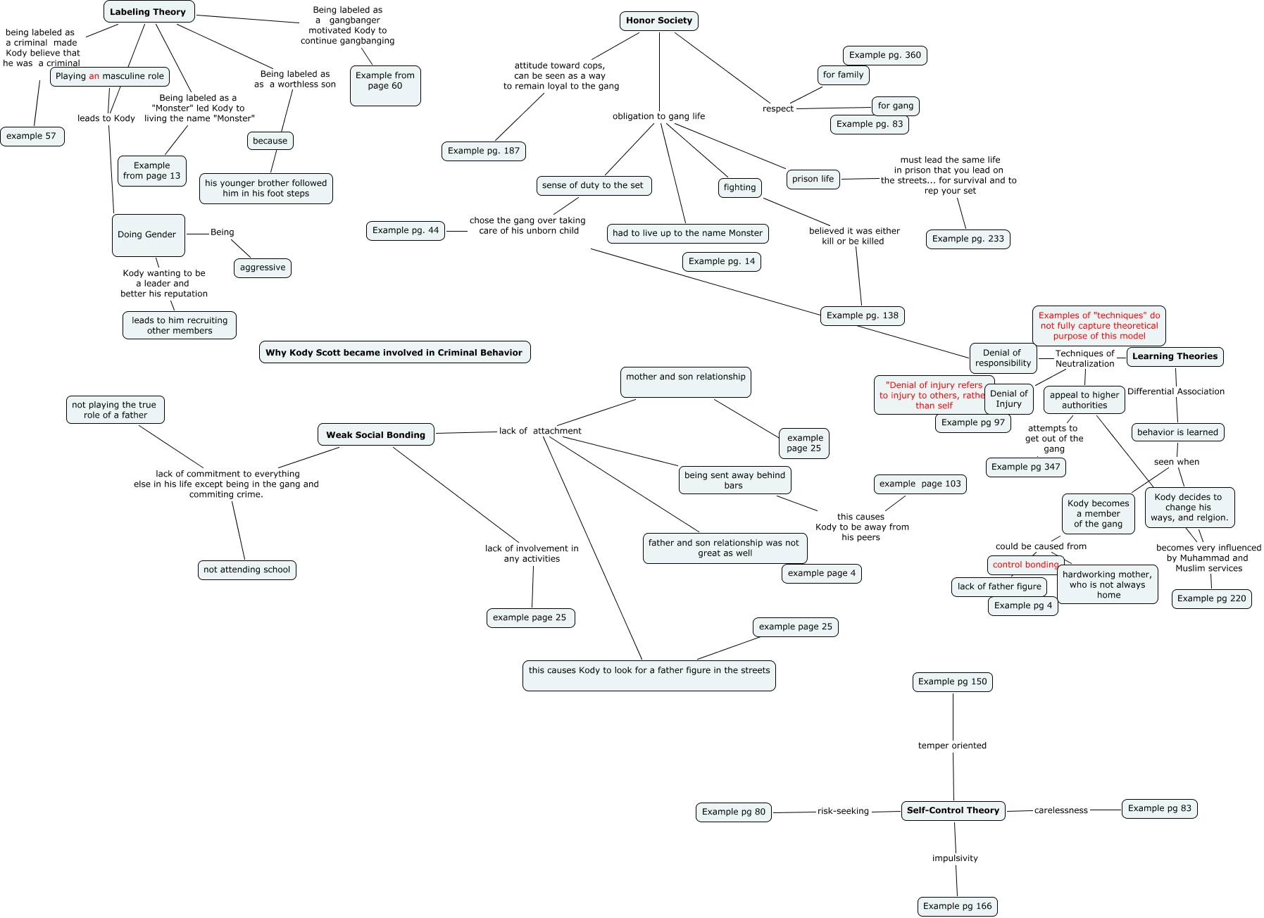 This Concept Map, created with IHMC CmapTools, has information related to: Final Draft of Monster Cmap, Weak Social Bonding lack of attachment mother and son relationship, Honor Society respect for gang, Learning Theories Techniques of Neutralization appeal to higher authorities, Labeling Theory being labeled as a criminal made Kody believe that he was a criminal example 57, Self-Control Theory carelessness Example pg 83, sense of duty to the set chose the gang over taking care of his unborn child Example pg. 44, father and son relationship was not great as well ???? example page 4, Doing Gender Being aggressive, Kody becomes a member of the gang could be caused from lack of father figure, Self-Control Theory impulsivity Example pg 166, Labeling Theory Being labeled as as a worthless son his younger brother followed him in his foot steps, Weak Social Bonding lack of attachment being sent away behind bars, Kody becomes a member of the gang could be caused from hardworking mother, who is not always home, Self-Control Theory risk-seeking Example pg 80, Labeling Theory leads to Kody Doing Gender, Honor Society obligation to gang life sense of duty to the set, this causes Kody to look for a father figure in the streets ???? example page 25, Weak Social Bonding lack of commitment to everything else in his life except being in the gang and commiting crime. not attending school, Honor Society respect for family, Honor Society obligation to gang life fighting