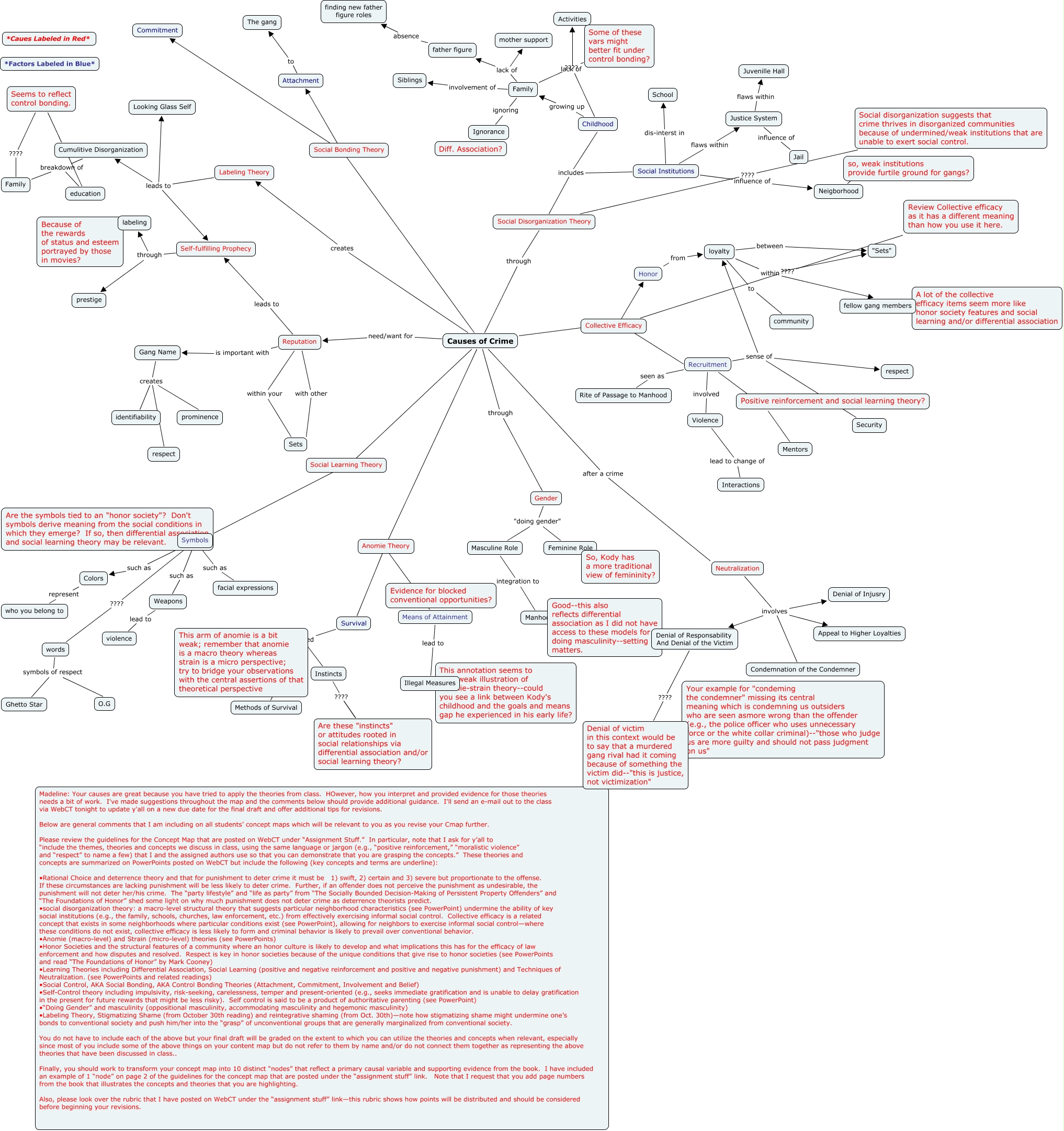 This Concept Map, created with IHMC CmapTools, has information related to: Madeline Wallace -Monster, Gang Name creates prominence, Colors represent who you belong to, Social Disorganization Theory ???? Social disorganization suggests that crime thrives in disorganized communities because of undermined/weak institutions that are unable to exert social control., loyalty within fellow gang members, Symbols such as Weapons, Childhood growing up Family, Social Institutions influence of Neigborhood, loyalty to community, Causes of Crime creates Labeling Theory, Violence lead to change of Interactions, Causes of Crime Symbols, Recruitment involved Violence, Causes of Crime through Social Disorganization Theory, Causes of Crime Attachment, Causes of Crime Means of Attainment, Causes of Crime Honor, Social Institutions flaws within Justice System, Symbols ???? words, Means of Attainment lead to Illegal Measures, Causes of Crime Survival