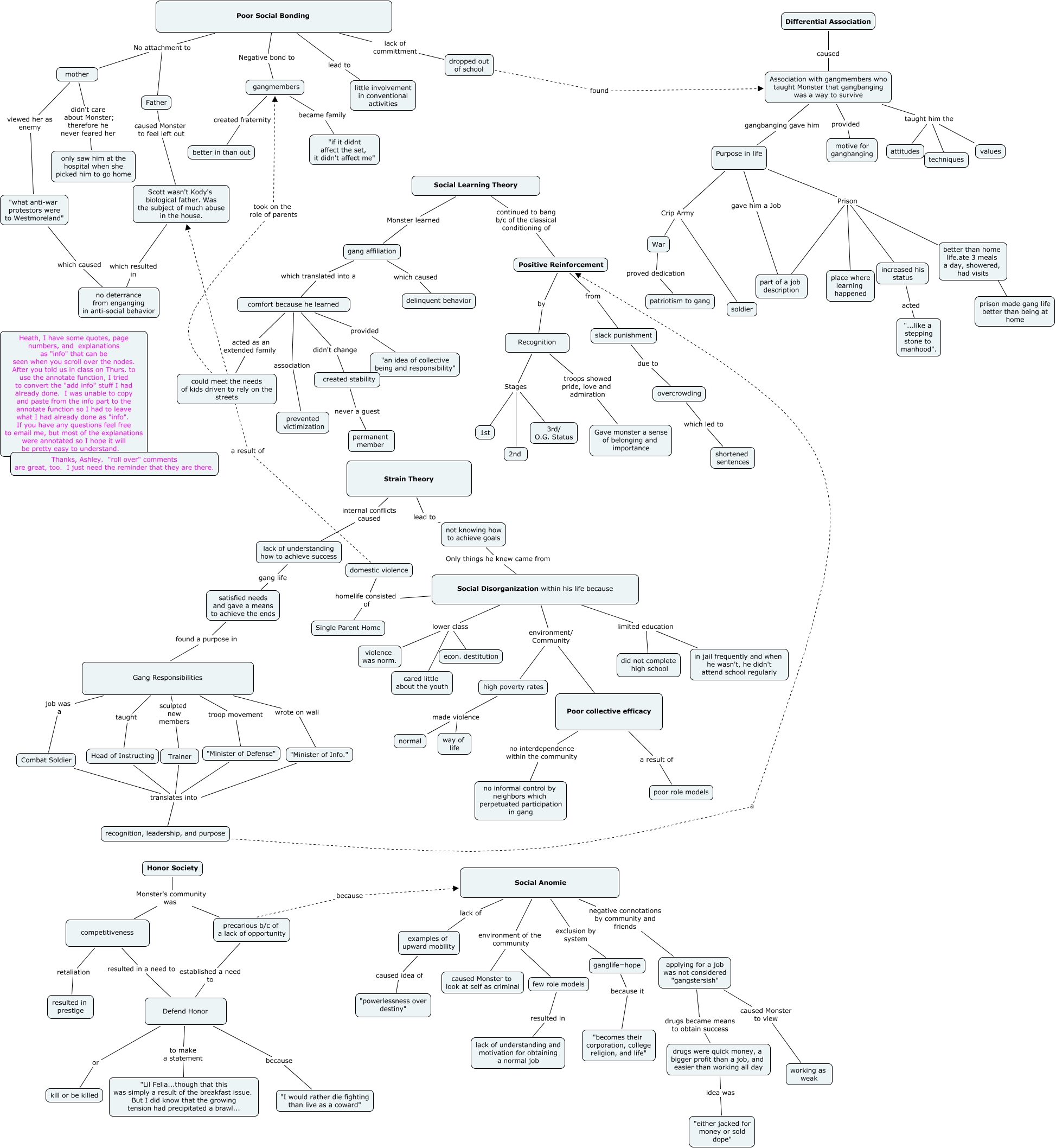 This Concept Map, created with IHMC CmapTools, has information related to: Monster2, Poor collective efficacy no interdependence within the community no informal control by neighbors which perpetuated participation in gang, Social Disorganization within his life because lower class econ. destitution, precarious b/c of a lack of opportunity established a need to Defend Honor, Social Learning Theory continued to bang b/c of the classical conditioning of Positive Reinforcement, satisfied needs and gave a means to achieve the ends found a purpose in Gang Responsibilities, slack punishment due to overcrowding, Gang Responsibilities troop movement "Minister of Defense", Social Disorganization within his life because limited education did not complete high school, Poor Social Bonding lead to little involvement in conventional activities, gangmembers became family "if it didnt affect the set, it didn't affect me", gang affiliation which translated into a comfort because he learned, Gang Responsibilities wrote on wall "Minister of Info.", Social Disorganization within his life because lower class violence was norm., Purpose in life Prison part of a job description, ganglife=hope because it "becomes their corporation, college religion, and life", Social Disorganization within his life because environment/ Community Poor collective efficacy, Association with gangmembers who taught Monster that gangbanging was a way to survive provided motive for gangbanging, Positive Reinforcement by Recognition, overcrowding which led to shortened sentences, Gang Responsibilities sculpted new members Trainer