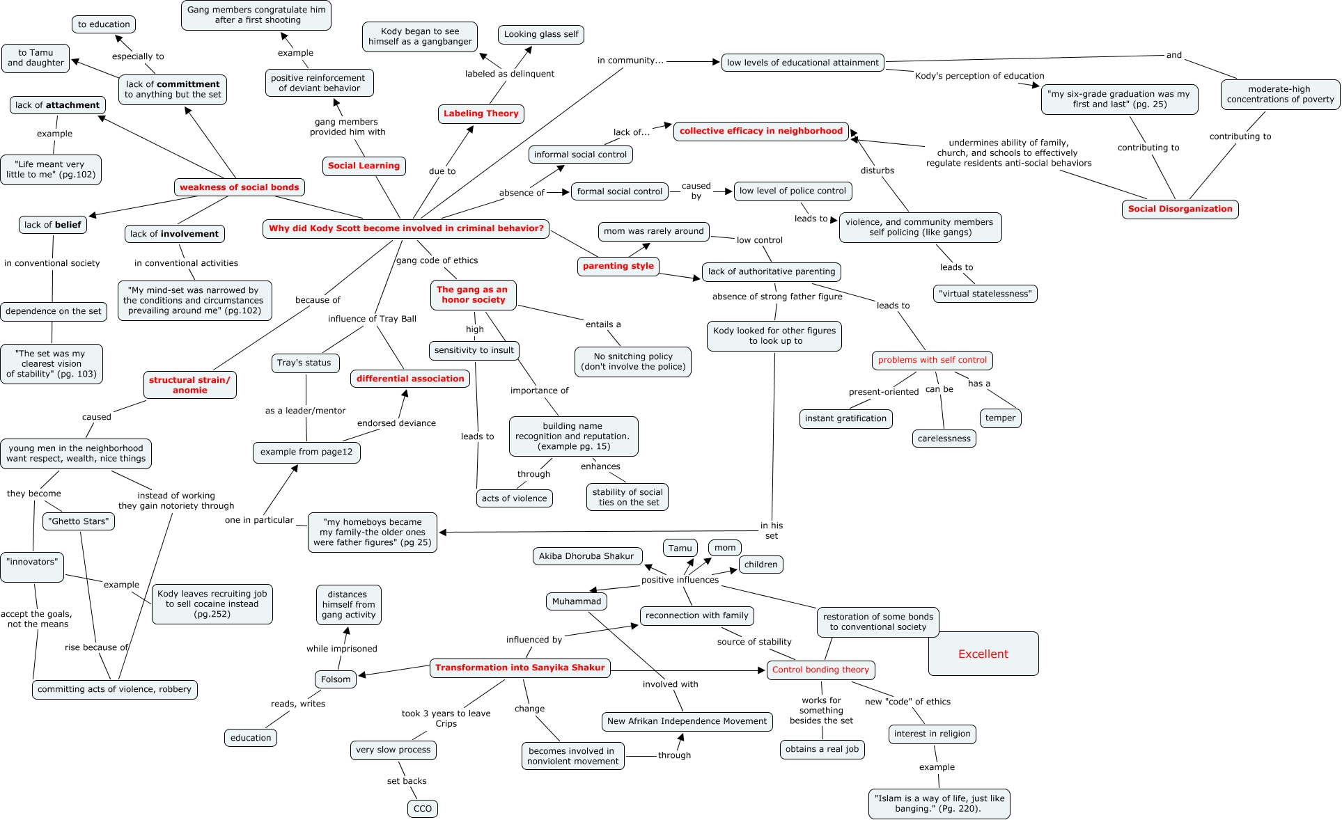 This Concept Map, created with IHMC CmapTools, has information related to: Monster, Labeling Theory labeled as delinquent Looking glass self, "innovators" example Kody leaves recruiting job to sell cocaine instead (pg.252), lack of authoritative parenting absence of strong father figure Kody looked for other figures to look up to, low levels of educational attainment Kody's perception of education "my six-grade graduation was my first and last" (pg. 25), Transformation into Sanyika Shakur ???? Control bonding theory, "my homeboys became my family-the older ones were father figures" (pg 25) one in particular example from page12, building name recognition and reputation. (example pg. 15) through acts of violence, Folsom while imprisoned distances himself from gang activity, Transformation into Sanyika Shakur change becomes involved in nonviolent movement, The gang as an honor society entails a No snitching policy (don't involve the police), reconnection with family positive influences Tamu, Why did Kody Scott become involved in criminal behavior? absence of informal social control, violence, and community members self policing (like gangs) leads to "virtual statelessness", restoration of some bonds to conventional society positive influences Akiba Dhoruba Shakur, Why did Kody Scott become involved in criminal behavior? lack of involvement, sensitivity to insult leads to acts of violence, reconnection with family positive influences Akiba Dhoruba Shakur, example from page12 endorsed deviance differential association, reconnection with family positive influences mom, reconnection with family positive influences children
