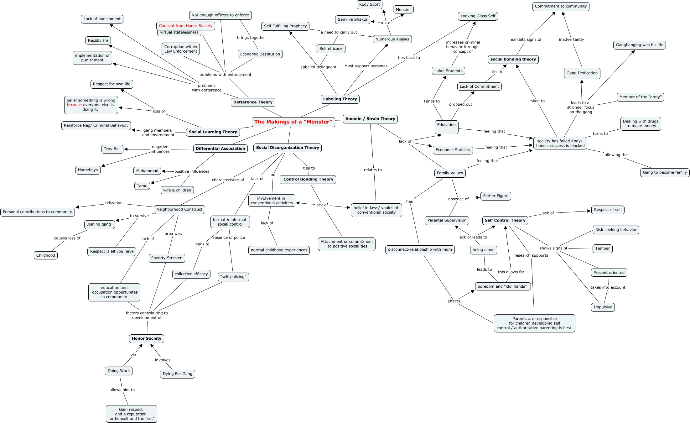 This Concept Map, created with IHMC CmapTools, has information related to: O.G. Status Complete, Poverty Stricken factors contributing to development of Honor Society, Lack of Commitment ties to social bonding theory, Present oriented shows signs of Impulsive, "self-policing" factors contributing to development of Honor Society, Anomie / Strain Theory lack of Family Values, collective efficacy factors contributing to development of Honor Society, Control Bonding Theory lack of Attachment or commitment to positive social ties, Numerous Aliases a.k.a. Monster, society has failed Kody/ honest success is blocked linked to social bonding theory, education and occupation oppurtunites in community factors contributing to development of Honor Society, Differential Association negative influences Tray Ball, involvement in conventional activities lack of normal childhood experiences, boredom and "idol hands" this allows for Self Control Theory, Social Disorganization Theory no involvement in conventional activities, Dying For Gang involves Honor Society, Social Disorganization Theory lack of formal & informal social control, Joining gang causes loss of Childhood, Risk seeking behavior shows signs of Impulsive, Family Values feeling that society has failed Kody/ honest success is blocked, Numerous Aliases a.k.a. Sanyika Shakur