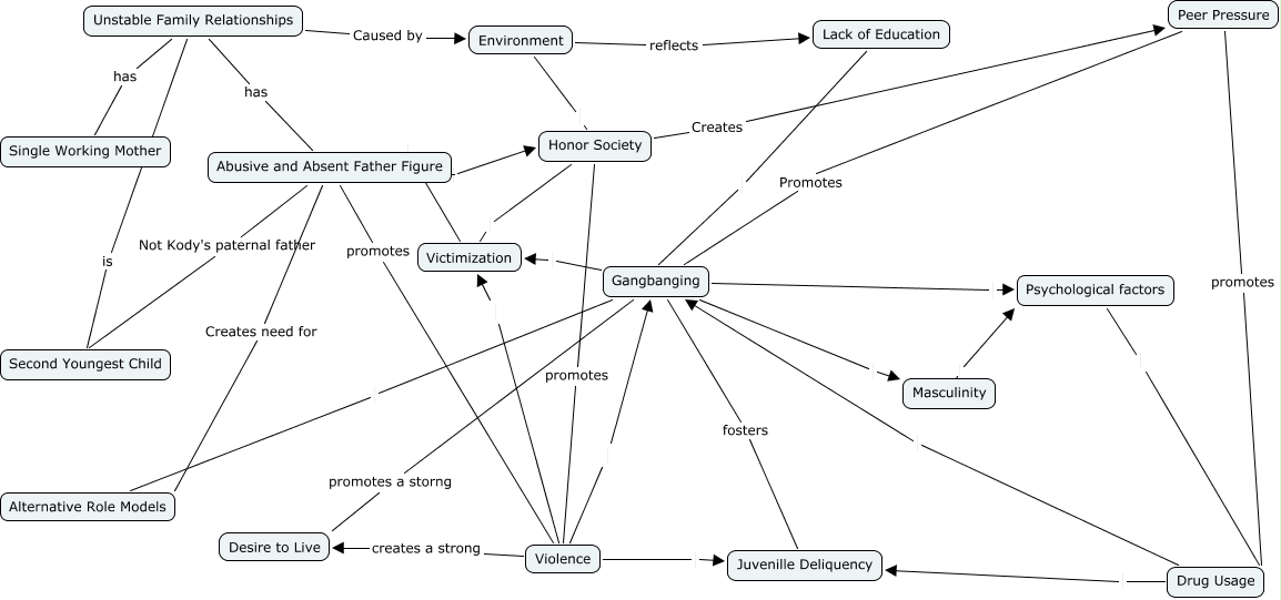 This Concept Map, created with IHMC CmapTools, has information related to: Monster, Abusive and Absent Father Figure Victimization, Environment Honor Society, Drug Usage Gangbanging, Lack of Education Gangbanging, Gangbanging Victimization, Gangbanging Alternative Role Models, Abusive and Absent Father Figure Creates need for Alternative Role Models, Gangbanging fosters Juvenille Deliquency, Gangbanging Masculinity, Abusive and Absent Father Figure promotes Violence, Peer Pressure Promotes Gangbanging, Honor Society promotes Violence, Drug Usage Juvenille Deliquency, Honor Society Victimization, Abusive and Absent Father Figure Honor Society, Unstable Family Relationships has Single Working Mother, Unstable Family Relationships has Abusive and Absent Father Figure, Violence Victimization, Environment reflects Lack of Education, Masculinity Psychological factors