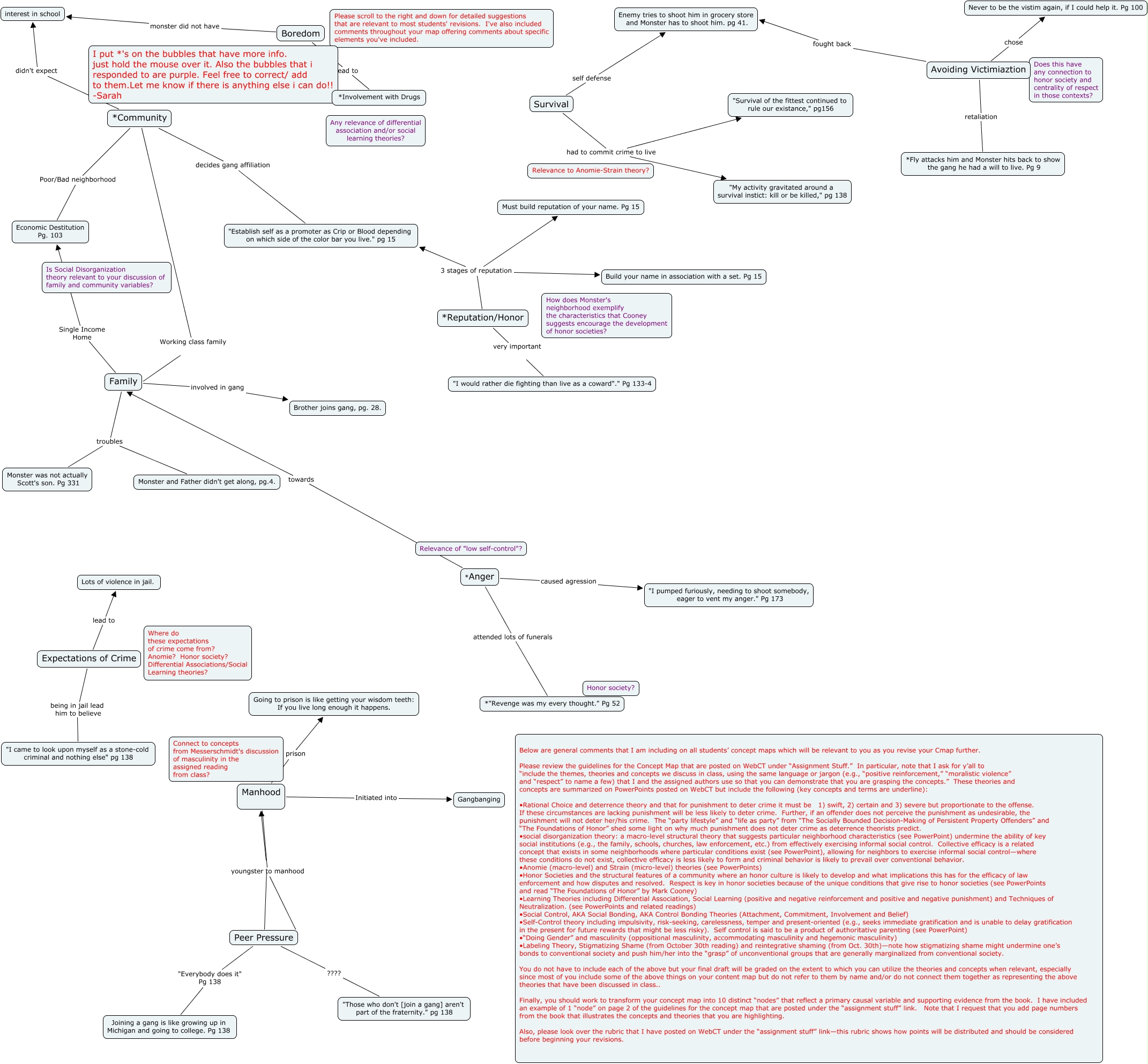 This Concept Map, created with IHMC CmapTools, has information related to: cmap, Expectations of Crime being in jail lead him to believe "I came to look upon myself as a stone-cold criminal and nothing else" pg 138, Boredom lead to *Involvement with Drugs, *Reputation/Honor 3 stages of reputation Build your name in association with a set. Pg 15, *Reputation/Honor very important "I would rather die fighting than live as a coward"." Pg 133-4, *Community Poor/Bad neighborhood Economic Destitution Pg. 103, Family Single Income Home Economic Destitution Pg. 103, Manhood Initiated into Gangbanging, Family troubles Monster was not actually Scott's son. Pg 331, Family troubles Monster and Father didn't get along, pg.4., *Reputation/Honor 3 stages of reputation Must build reputation of your name. Pg 15, Survival had to commit crime to live "Survival of the fittest continued to rule our existance," pg156, *Community Working class family Family, *Reputation/Honor 3 stages of reputation "Establish self as a promoter as Crip or Blood depending on which side of the color bar you live." pg 15, Manhood = prison Going to prison is like getting your wisdom teeth: If you live long enough it happens., Survival had to commit crime to live "My activity gravitated around a survival instict: kill or be killed," pg 138, Survival self defense Enemy tries to shoot him in grocery store and Monster has to shoot him. pg 41., Peer Pressure Manhood, Peer Pressure ???? "Those who don't [join a gang] aren't part of the fraternity." pg 138, Avoiding Victimiaztion chose Never to be the vistim again, if I could help it. Pg 100, *Community didn't expect interest in school