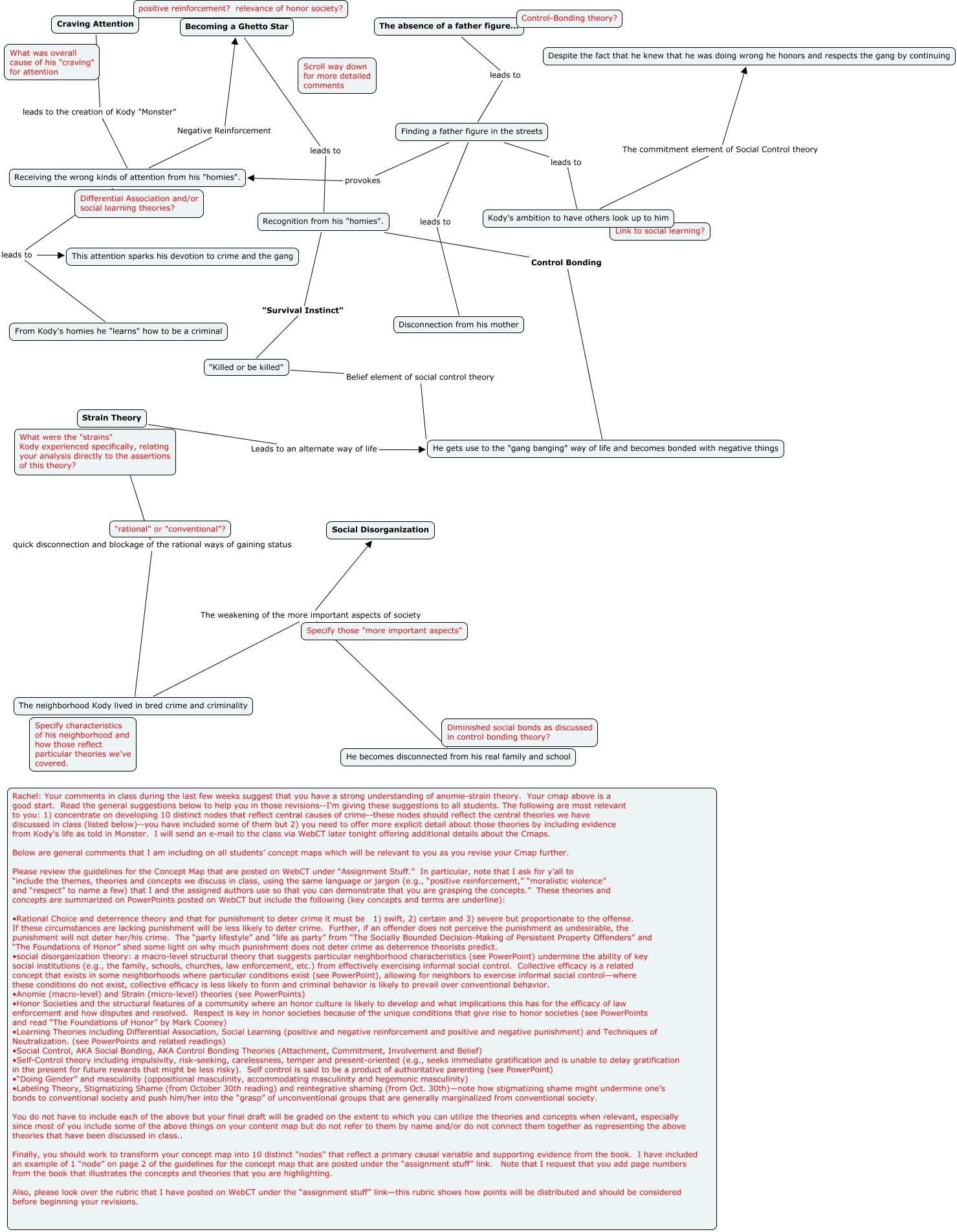 This Concept Map, created with IHMC CmapTools, has information related to: Monster Cmap, Craving Attention leads to the creation of Kody "Monster" Receiving the wrong kinds of attention from his "homies"., Kody's ambition to have others look up to him The commitment element of Social Control theory Despite the fact that he knew that he was doing wrong he honors and respects the gang by continuing, The neighborhood Kody lived in bred crime and criminality The weakening of the more important aspects of society He becomes disconnected from his real family and school, Finding a father figure in the streets leads to Disconnection from his mother, Recognition from his "homies". Control Bonding He gets use to the "gang banging" way of life and becomes bonded with negative things, "Killed or be killed" Belief element of social control theory He gets use to the "gang banging" way of life and becomes bonded with negative things, Strain Theory quick disconnection and blockage of the rational ways of gaining status The neighborhood Kody lived in bred crime and criminality, Becoming a Ghetto Star leads to Recognition from his "homies"., Finding a father figure in the streets provokes Receiving the wrong kinds of attention from his "homies"., Strain Theory Leads to an alternate way of life He gets use to the "gang banging" way of life and becomes bonded with negative things, Receiving the wrong kinds of attention from his "homies". leads to From Kody's homies he "learns" how to be a criminal, Finding a father figure in the streets leads to Kody's ambition to have others look up to him, The neighborhood Kody lived in bred crime and criminality The weakening of the more important aspects of society Social Disorganization, Receiving the wrong kinds of attention from his "homies". Negative Reinforcement Becoming a Ghetto Star, Recognition from his "homies". "Survival Instinct" "Killed or be killed", Receiving the wrong kinds of attention from his "homies". leads to This attention sparks his devotion to crime and the gang, The absence of a father figure... leads to Finding a father figure in the streets