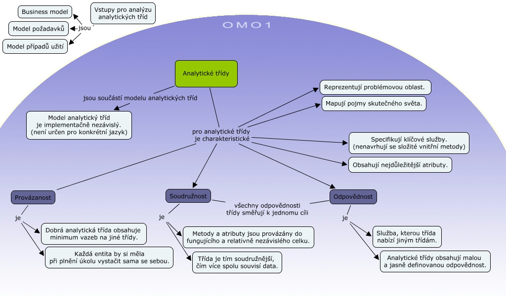 Tato Cmapa, vytvořená pomocí CmapTools, obsahuje informaci související s: Class charakteristic, Analytické třídy pro analytické třídy je charakteristické Odpovědnost, Analytické třídy pro analytické třídy je charakteristické Obsahují nejdůležitější atributy., Soudružnost je Třída je tím soudružnější, čím více spolu souvisí data., Vstupy pro analýzu analytických tříd jsou Business model, Odpovědnost je Služba, kterou třída nabízí jiným třídám., Provázanost je Dobrá analytická třída obsahuje minimum vazeb na jiné třídy., Analytické třídy pro analytické třídy je charakteristické Soudružnost, Vstupy pro analýzu analytických tříd jsou Model požadavků, Odpovědnost je Analytické třídy obsahují malou a jasně definovanou odpovědnost., Analytické třídy pro analytické třídy je charakteristické Specifikují klíčové služby. (nenavrhují se složité vnitřní metody), Soudružnost všechny odpovědnosti třídy směřují k jednomu cíli Odpovědnost, Analytické třídy pro analytické třídy je charakteristické Mapují pojmy skutečného světa., Analytické třídy pro analytické třídy je charakteristické Provázanost, Analytické třídy pro analytické třídy je charakteristické Reprezentují problémovou oblast., Vstupy pro analýzu analytických tříd jsou Model případů užití, Analytické třídy jsou součástí modelu analytických tříd Model analytický tříd je implementačně nezávislý. (není určen pro konkrétní jazyk), Soudružnost je Metody a atributy jsou provázány do fungujícího a relativně nezávislého celku., Provázanost je Každá entita by si měla při plnění úkolu vystačit sama se sebou.