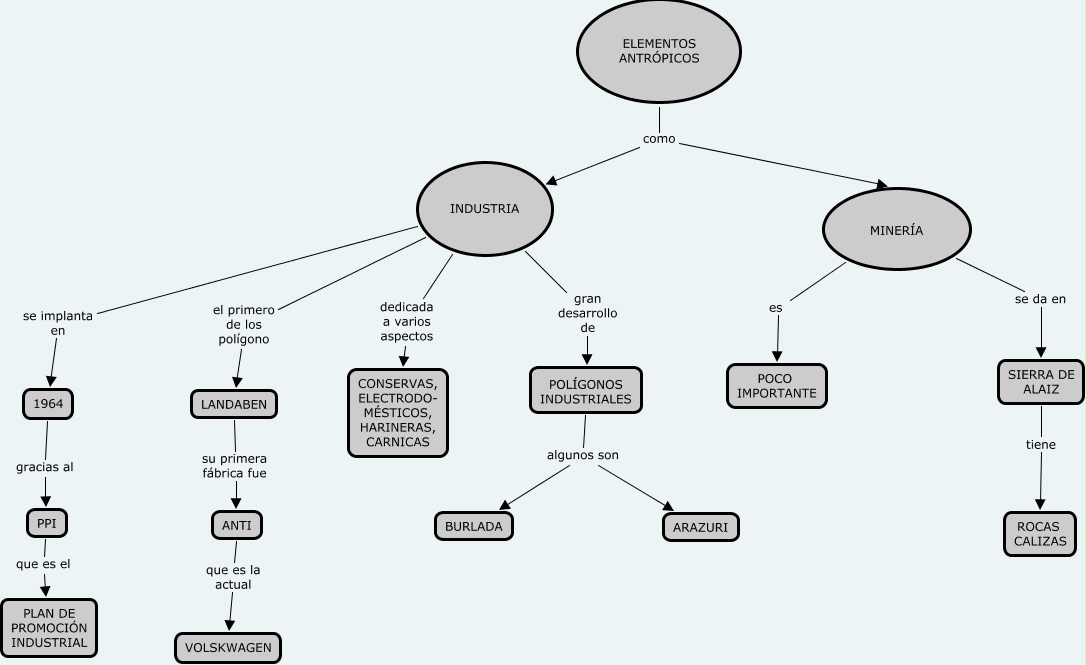 Este Cmap, tiene información relacionada con: industria y mineria, MINERÍA es POCO IMPORTANTE, POLÍGONOS INDUSTRIALES algunos son BURLADA, INDUSTRIA gran desarrollo de POLÍGONOS INDUSTRIALES, INDUSTRIA dedicada a varios aspectos CONSERVAS, ELECTRODO- MÉSTICOS, HARINERAS, CARNICAS, LANDABEN su primera fábrica fue ANTI, MINERÍA se da en SIERRA DE ALAIZ, ELEMENTOS ANTRÓPICOS como MINERÍA, SIERRA DE ALAIZ tiene ROCAS CALIZAS, PPI que es el PLAN DE PROMOCIÓN INDUSTRIAL, INDUSTRIA se implanta en 1964, ELEMENTOS ANTRÓPICOS como INDUSTRIA, INDUSTRIA el primero de los polígono LANDABEN, ANTI que es la actual VOLSKWAGEN, 1964 gracias al PPI, POLÍGONOS INDUSTRIALES algunos son ARAZURI