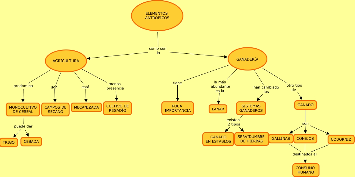 Este Cmap, tiene información relacionada con: agricultura y ganaderia, AGRICULTURA predomina MONOCULTIVO DE CEREAL, CODORNIZ destinados al CONSUMO HUMANO, GALLINAS destinados al CONSUMO HUMANO, ELEMENTOS ANTRÓPICOS como son la AGRICULTURA, GANADERÍA han cambiado los SISTEMAS GANADEROS, GANADERÍA la más abundante es la LANAR, MONOCULTIVO DE CEREAL puede der TRIGO, SISTEMAS GANADEROS existen 2 tipos GANADO EN ESTABLOS, GANADERÍA tiene POCA IMPORTANCIA, AGRICULTURA está MECANIZADA, GANADO son CODORNIZ, AGRICULTURA menos presencia CULTIVO DE REGADÍO, AGRICULTURA son CAMPOS DE SECANO, CONEJOS destinados al CONSUMO HUMANO, MONOCULTIVO DE CEREAL puede der CEBADA, ELEMENTOS ANTRÓPICOS como son la GANADERÍA, GANADERÍA otro tipo de GANADO, GANADO son CONEJOS, GANADO son GALLINAS, SISTEMAS GANADEROS existen 2 tipos SERVIDUMBRE DE HIERBAS