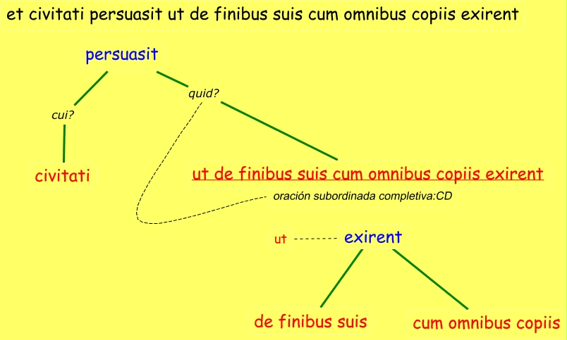 Este Cmap, tiene información relacionada con: completiva, ut ???? exirent, ut de finibus suis cum omnibus copiis exirent quid? persuasit, de finibus suis ???? exirent, civitati cui? persuasit, ut de finibus suis cum omnibus copiis exirent quid? oración subordinada completiva:CD, cum omnibus copiis exirent
