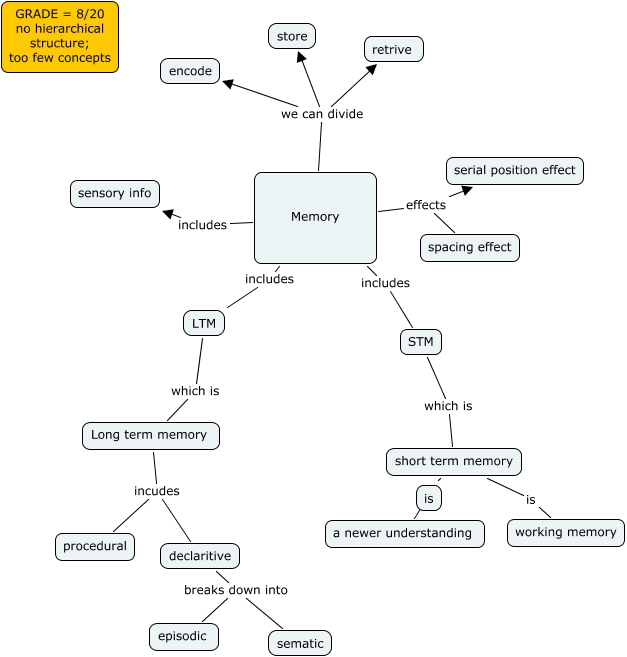 This Concept Map, created with IHMC CmapTools, has information related to: jessica dowden, declaritive breaks down into sematic, short term memory is working memory, Long term memory incudes declaritive, Long term memory incudes procedural, Memory includes LTM, Memory we can divide store, STM which is short term memory, Memory effects serial position effect, Memory we can divide retrive, Memory effects spacing effect, Memory we can divide encode, declaritive breaks down into episodic, LTM which is Long term memory, short term memory a newer understanding, Memory includes sensory info, Memory includes STM