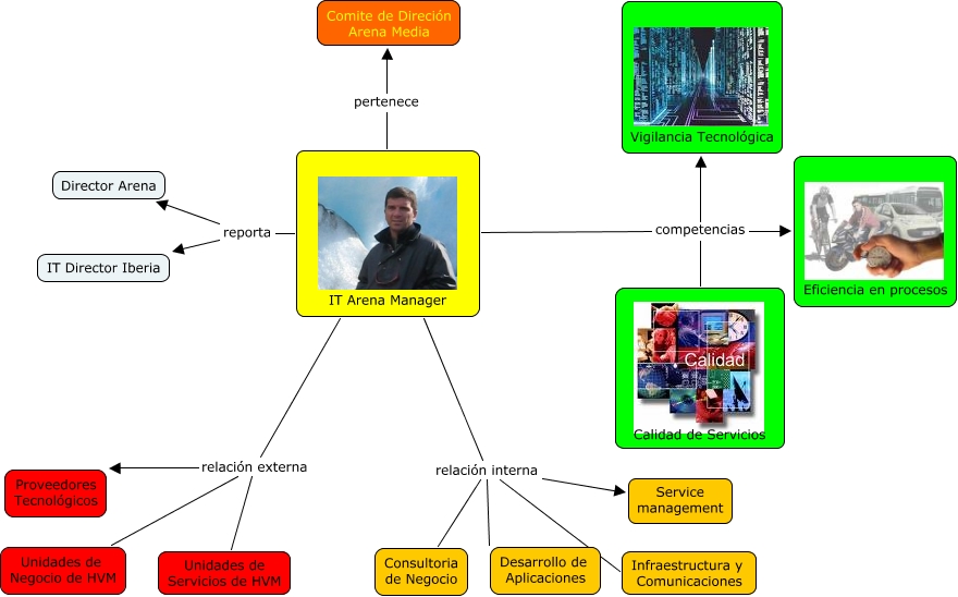 This Concept Map, created with IHMC CmapTools, has information related to: Define tu puesto de trabajo, IT Arena Manager relación interna Desarrollo de Aplicaciones, IT Arena Manager pertenece Comite de Direción Arena Media, IT Arena Manager relación externa Unidades de Servicios de HVM, IT Arena Manager relación interna Consultoria de Negocio, IT Arena Manager reporta Director Arena, IT Arena Manager competencias Calidad de Servicios, IT Arena Manager relación externa Unidades de Negocio de HVM, IT Arena Manager relación interna Service management, IT Arena Manager competencias Vigilancia Tecnológica, IT Arena Manager relación externa Proveedores Tecnológicos, IT Arena Manager reporta IT Director Iberia, IT Arena Manager relación interna Infraestructura y Comunicaciones, IT Arena Manager competencias Eficiencia en procesos